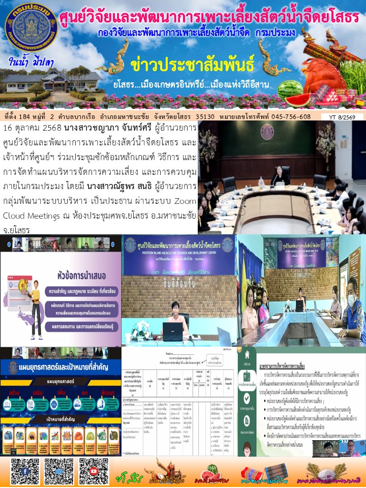 นางสาวชญาภา จันทร์ศรี ผู้อำนวยการศูนย์วิจัยและพัฒนาการเพาะเลี้ยงสัตว์น้ำจืดยโสธร และเจ้าหน้าที่ศูนย์ฯ ร่วมประชุมซักซ้อมหลักเกณฑ์ วิธีการ และการจัดทำแผนบริหารจัดการความเสี่ยง และการควบคุมภายในกรมประมง