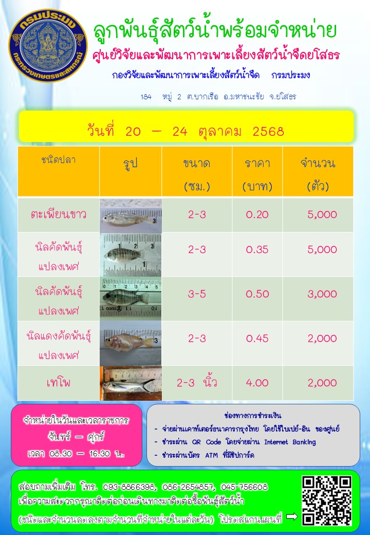 ลูกพันธุ์สัตว์น้ำพร้อมจำหน่าย 20 - 24 ตุลาคม 2568 ของศูนย์วิจัยและพัฒนาการเพาะเลี้ยงสัตว์น้ำจืดยโสธร