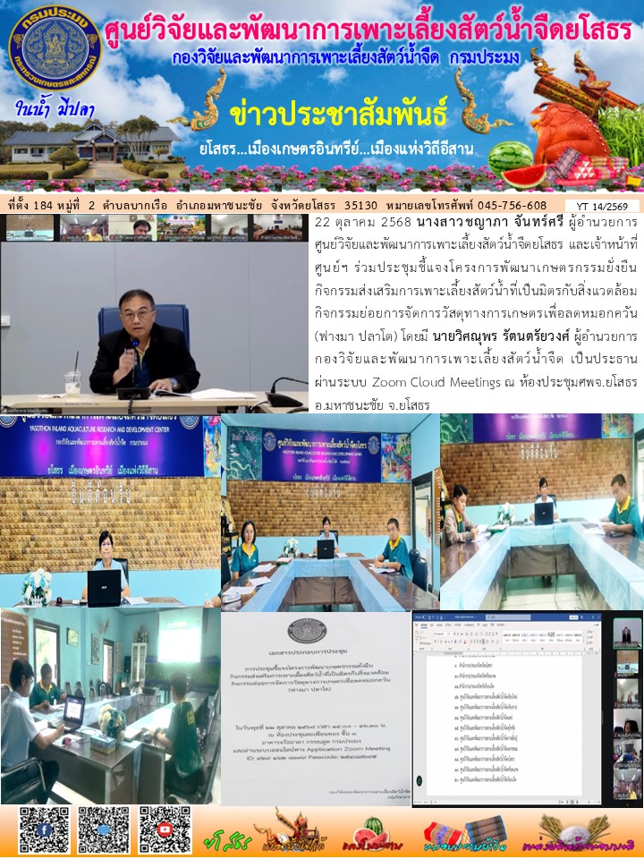 - [12:15] ทั่วไป นางสมพร โกศล ผู้อำนวยการศูนย์วิจัยและพัฒนาการเพาะเลี้ยงสัตว์น้ำจืดยโสธร และเจ้าหน้าที่ศูนย์ฯ ร่วมประชุมตรวจติดตามความก้าวหน้าผลการดำเนินงานตามแผนการตรวจราชการของผู้ตรวจราชการกระทรวงเกษตรและสหกรณ์ ประจำปีงบประมาณ พ.ศ. 2569 รอบที่ 1