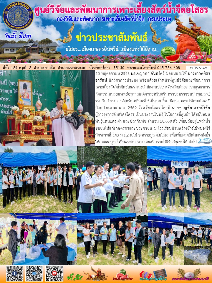 - [14:44] ทั่วไป เจ้าหน้าที่ศพจ.ยโสธรร่วมกับปอ.มหาชนะชัย และคณะกรรมการแหล่งน้ำ ในกิจกรรมบริหารจัดการทรัพยากรประมงน้ำจืด การเพิ่มผลผลิตสัตว์น้ำในแหล่งน้ำชุมชนฯ ประจำปีงบประมาณ 2569 ลงพื้นที่ปล่อยพันธุ์ปลาที่พร้อม 3 ชนิด ในพื้นที่ บึงพระเสาร์