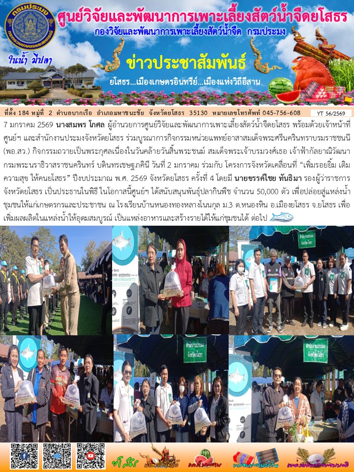 - [14:44] ทั่วไป เจ้าหน้าที่ศพจ.ยโสธรร่วมกับปอ.มหาชนะชัย และคณะกรรมการแหล่งน้ำ ในกิจกรรมบริหารจัดการทรัพยากรประมงน้ำจืด การเพิ่มผลผลิตสัตว์น้ำในแหล่งน้ำชุมชนฯ ประจำปีงบประมาณ 2569 ลงพื้นที่ปล่อยพันธุ์ปลาที่พร้อม 3 ชนิด ในพื้นที่ บึงพระเสาร์
