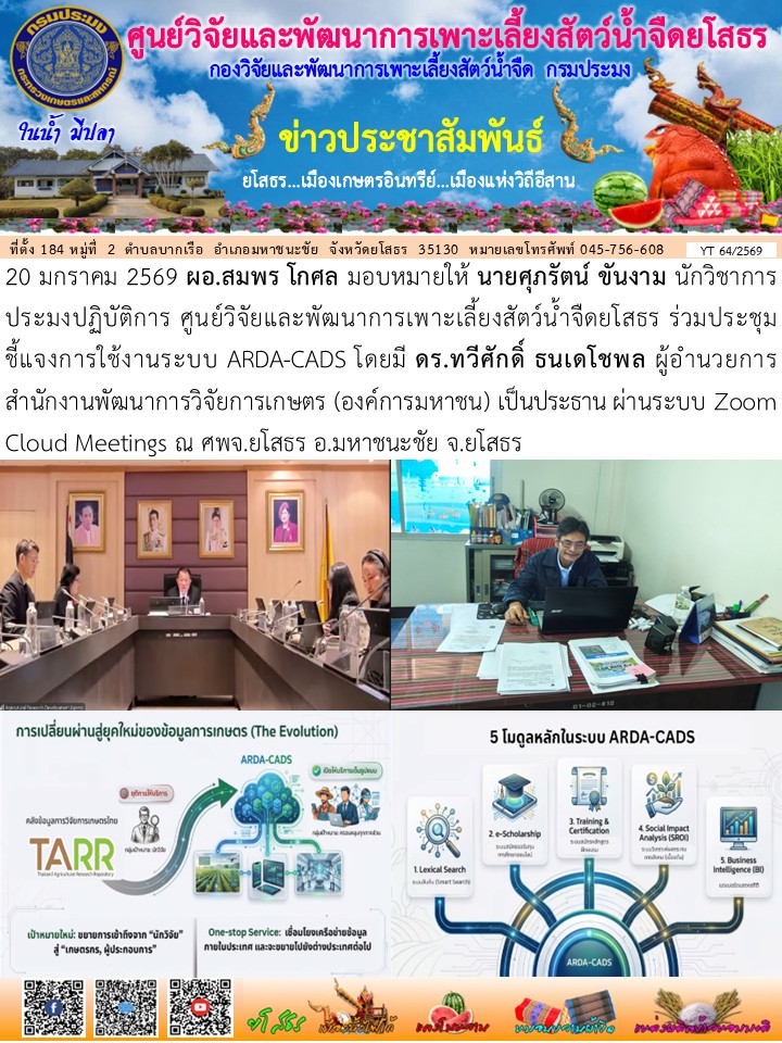 นายศุภรัตน์ ขันงาม นักวิชาการประมงปฏิบัติการ ศูนย์วิจัยและพัฒนาการเพาะเลี้ยงสัตว์น้ำจืดยโสธร ร่วมประชุมชี้แจงการใช้งานระบบ ARDA-CADS