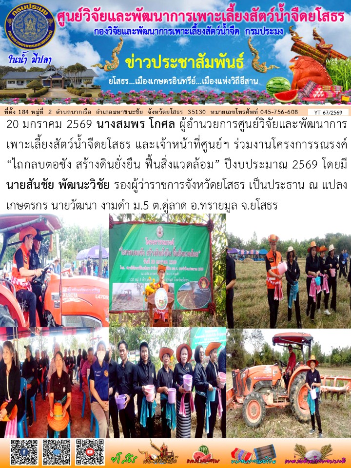 นางสมพร โกศล ผู้อำนวยการศูนย์วิจัยและพัฒนาการเพาะเลี้ยงสัตว์น้ำจืดยโสธร และเจ้าหน้าที่ศูนย์ฯ ร่วมงานโครงการรณรงค์ “ไถกลบตอซัง สร้างดินยั่งยืน ฟื้นสิ่งแวดล้อม” ปีงบประมาณ 2569