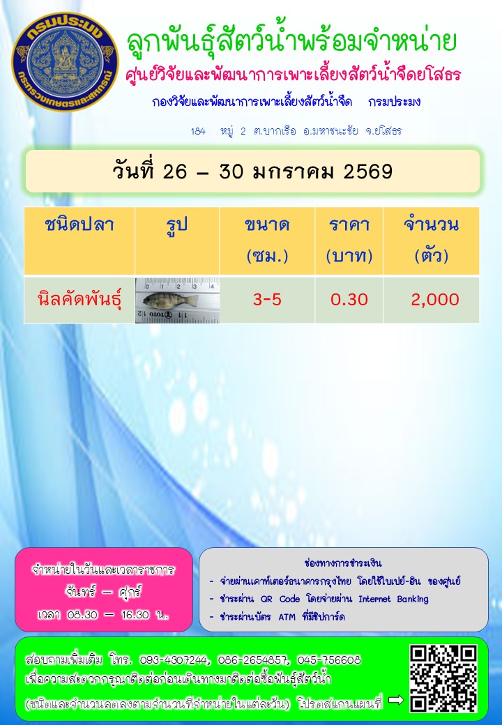 ลูกพันธุ์สัตว์น้ำพร้อมจำหน่าย 26 - 30 มกราคม 2569 ของศูนย์วิจัยและพัฒนาการเพาะเลี้ยงสัตว์น้ำจืดยโสธร