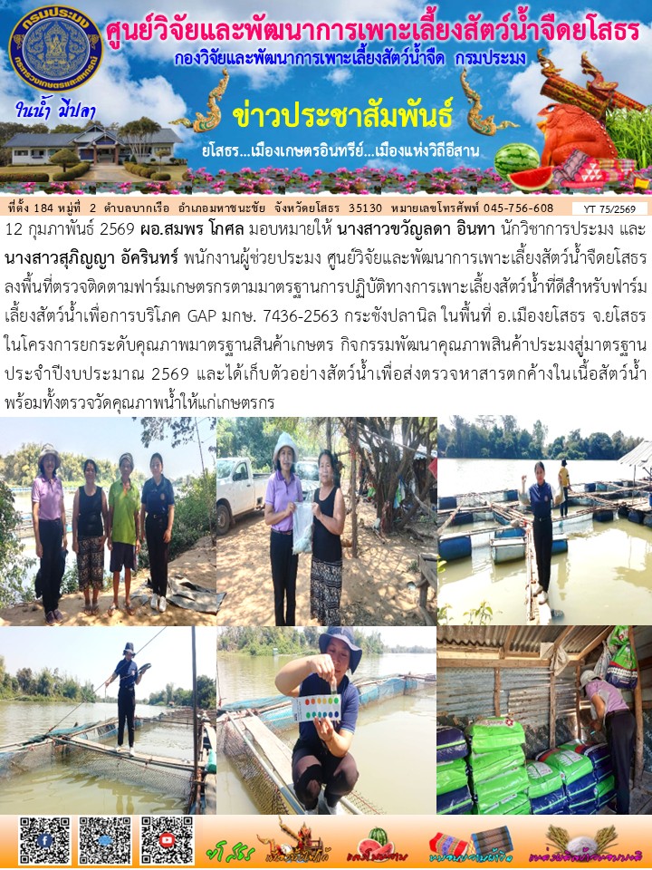 - [12:15] ทั่วไป นางสมพร โกศล ผู้อำนวยการศูนย์วิจัยและพัฒนาการเพาะเลี้ยงสัตว์น้ำจืดยโสธร และเจ้าหน้าที่ศูนย์ฯ ร่วมประชุมตรวจติดตามความก้าวหน้าผลการดำเนินงานตามแผนการตรวจราชการของผู้ตรวจราชการกระทรวงเกษตรและสหกรณ์ ประจำปีงบประมาณ พ.ศ. 2569 รอบที่ 1