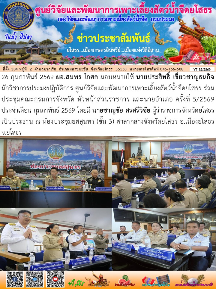 นายประสิทธิ์ เชี่ยวชาญธนกิจ นักวิชาการประมงปฏิบัติการ ศูนย์วิจัยและพัฒนาการเพาะเลี้ยงสัตว์น้ำจืดยโสธร ร่วมประชุมคณะกรมการจังหวัด หัวหน้าส่วนราชการ และนายอำเภอ ครั้งที่ 5/2569 ประจำเดือน กุมภาพันธ์ 2569