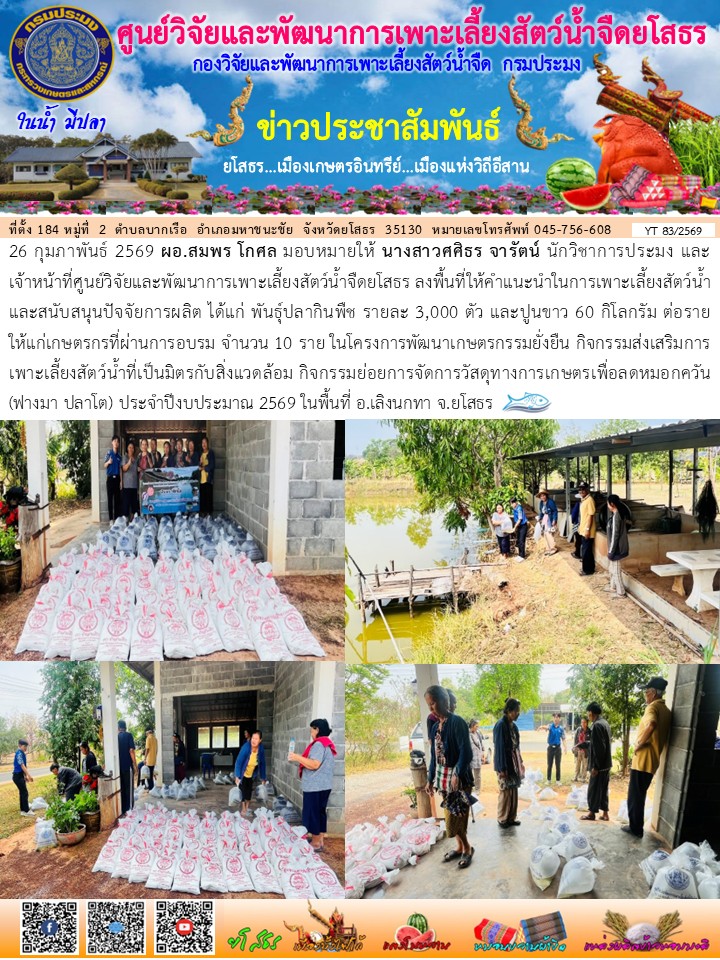 - [11:59] ทั่วไป ผอ.ศพจ.ยโสธร พร้อมด้วยคณะเจ้าหน้าที่ศูนย์ฯ จัดฝึกอบรมเกษตรกร หลักสูตร “พัฒนาศักยภาพเกษตรกรสู่ Smart Farmer” โครงการส่งเสริมอาชีพประมง กิจกรรมพัฒนาศักยภาพเกษตรกรสู่ Smart Farmer ประจำปีงบประมาณ 2569 รุ่นที่ 2 จำนวน 30 ราย