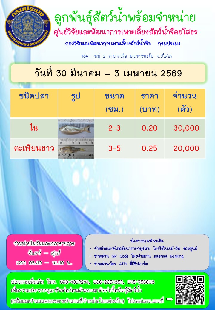 ลูกพันธุ์สัตว์น้ำพร้อมจำหน่าย 30 มีนาคม - 3 เมษายน 2569 ของศูนย์วิจัยและพัฒนาการเพาะเลี้ยงสัตว์น้ำจืดยโสธร