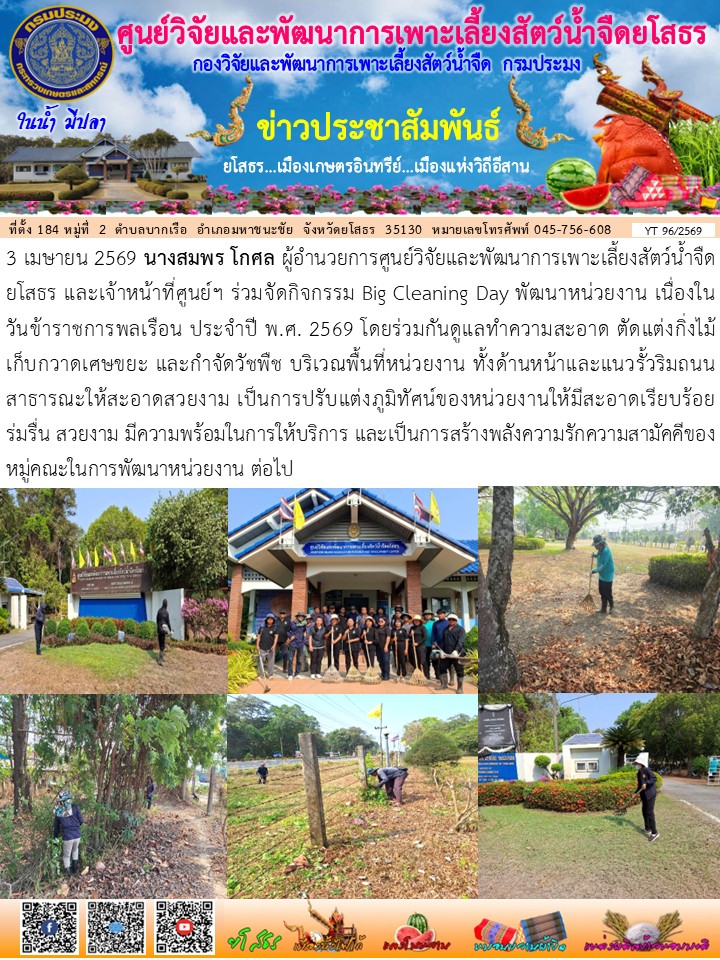 - [20:23] ทั่วไป นางสมพร โกศล ผู้อำนวยการศูนย์วิจัยและพัฒนาการเพาะเลี้ยงสัตว์น้ำจืดยโสธร และเจ้าหน้าที่ศูนย์ฯ ร่วมจัดกิจกรรม Big Cleaning Day พัฒนาหน่วยงาน เนื่องในวันข้าราชการพลเรือน ประจำปี พ.ศ. 2569