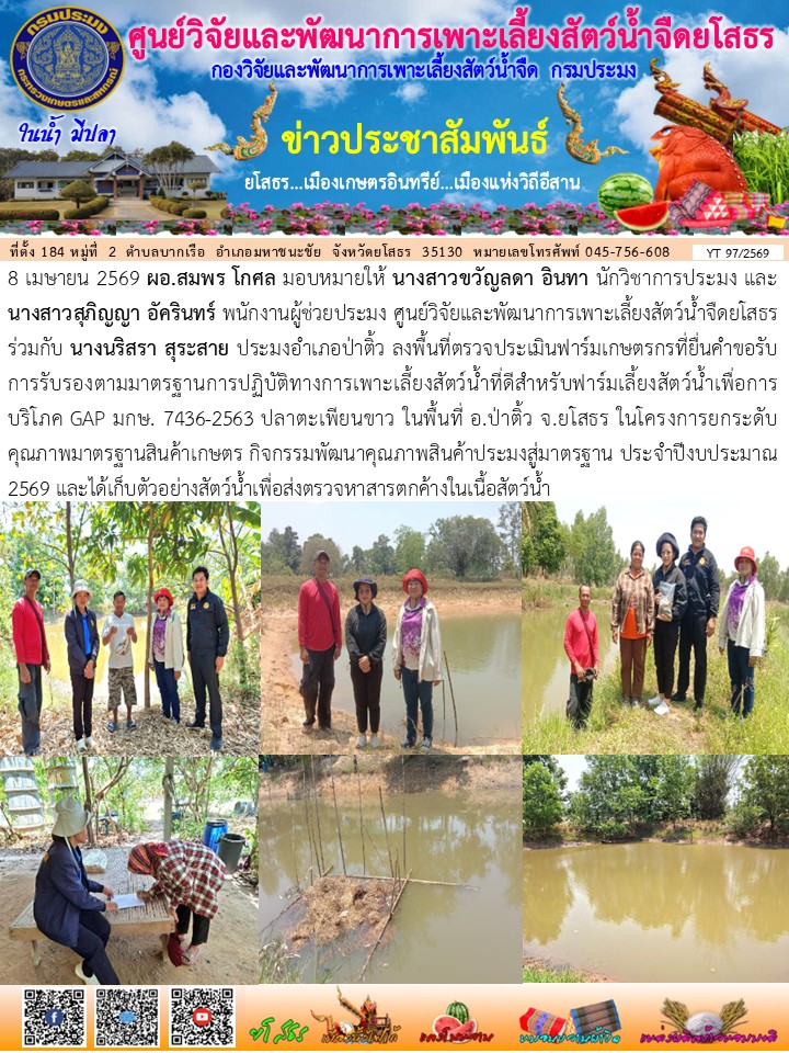 - [11:01] ทั่วไป เจ้าหน้าที่ศพจ.ยโสธร ร่วมกับปอ.ป่าติ้ว ลงพื้นที่ตรวจประเมินฟาร์มเกษตรกรที่ยื่นคำขอรับการรับรองตามมาตรฐานการปฏิบัติทางการเพาะเลี้ยงสัตว์น้ำที่ดีสำหรับฟาร์มเลี้ยงสัตว์น้ำเพื่อการบริโภค GAP มกษ. 7436-2563 ปลาตะเพียนขาว ในพื้นที่ อ.ป่าติ้ว จ.ยโสธร