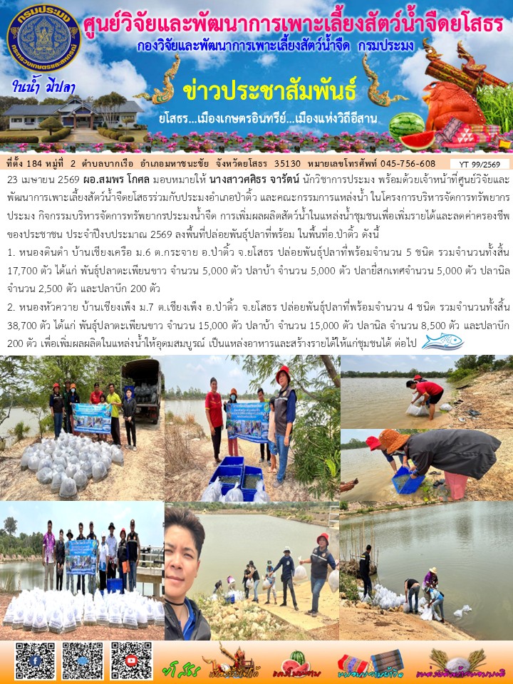- [13:20] ทั่วไป เจ้าหน้าที่ศพจ.ยโสธรร่วมกับปอ.ป่าติ้ว และคณะกรรมการแหล่งน้ำ ในกิจกรรมบริหารจัดการทรัพยากรประมงน้ำจืด การเพิ่มผลผลิตสัตว์น้ำในแหล่งน้ำชุมชน ลงพื้นที่ปล่อยพันธุ์ปลาที่พร้อมฯ ในพื้นที่ หนองดินดำ และหนองหัวควาย