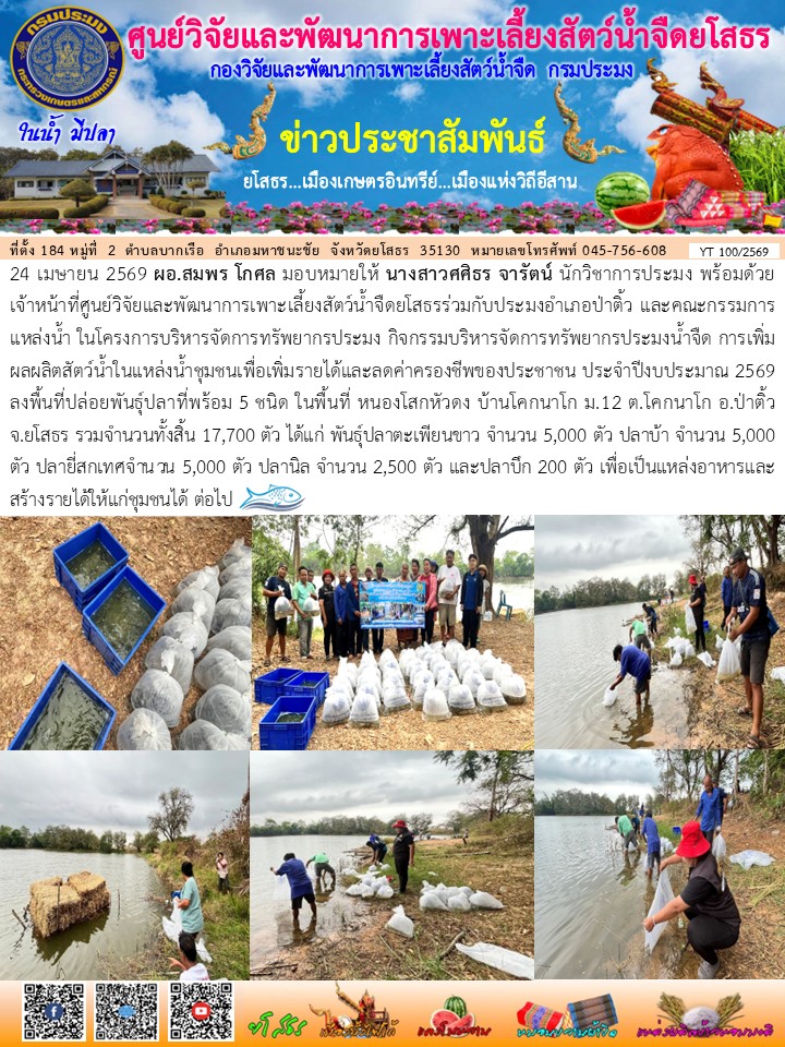 - [10:32] ทั่วไป ลูกพันธุ์สัตว์น้ำพร้อมจำหน่าย 7 - 10 เมษายน 2569 ของศูนย์วิจัยและพัฒนาการเพาะเลี้ยงสัตว์น้ำจืดยโสธร