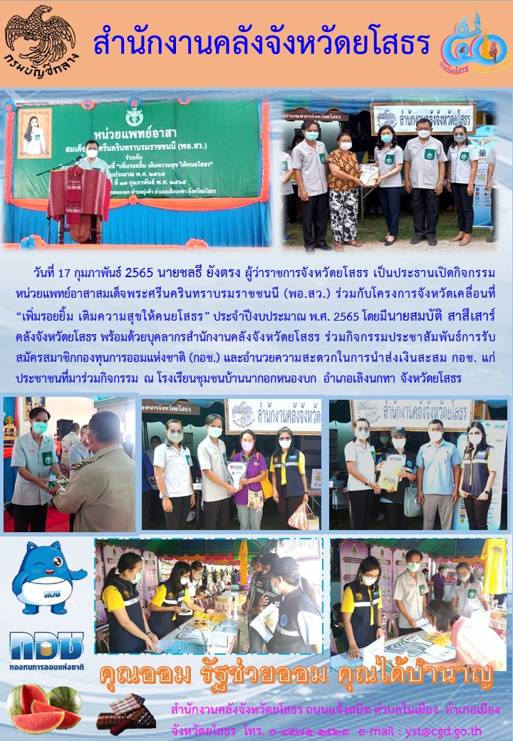 วันที่ 21 ก.พ. 2565 (21:49 น.)วันที่ 17 กุมภาพันธ์ 2565 นายชลธี ยังตรง ผู้ว่าราชการจังหวัดยโสธร เป็นประธานเปิดกิจกรรม หน่วยแพทย์อาสาสมเด็จพระศรีนครินทราบรมราชชนนี (พอ.สว.) ร่วมกับโครงการจังหวัดเคลื่อนที่ “เพิ่มรอยยิ้ม เติมความสุขให้คนยโสธร” ประจำปีงบประมาณ พ.ศ. 2565 โดยมีนายสมบัติ สาสีเสาร์ คลังจังหวัดยโสธร พร้อมด้วยบุคลากรสำนักงานคลังจังหวัดยโสธร ร่วมกิจกรรมประชาสัมพันธ์การรับสมัครสมาชิกกองทุนการออมแห่งชาติ (กอช.) และอำนวยความสะดวกในการนำส่งเงินสะสม กอช. แก่ประชาชนที่มาร่วมกิจกรรม ณ โรงเรียนชุมชนบ้านนากอกหนองบก อำเภอเลิงนกทา จังหวัดยโสธร