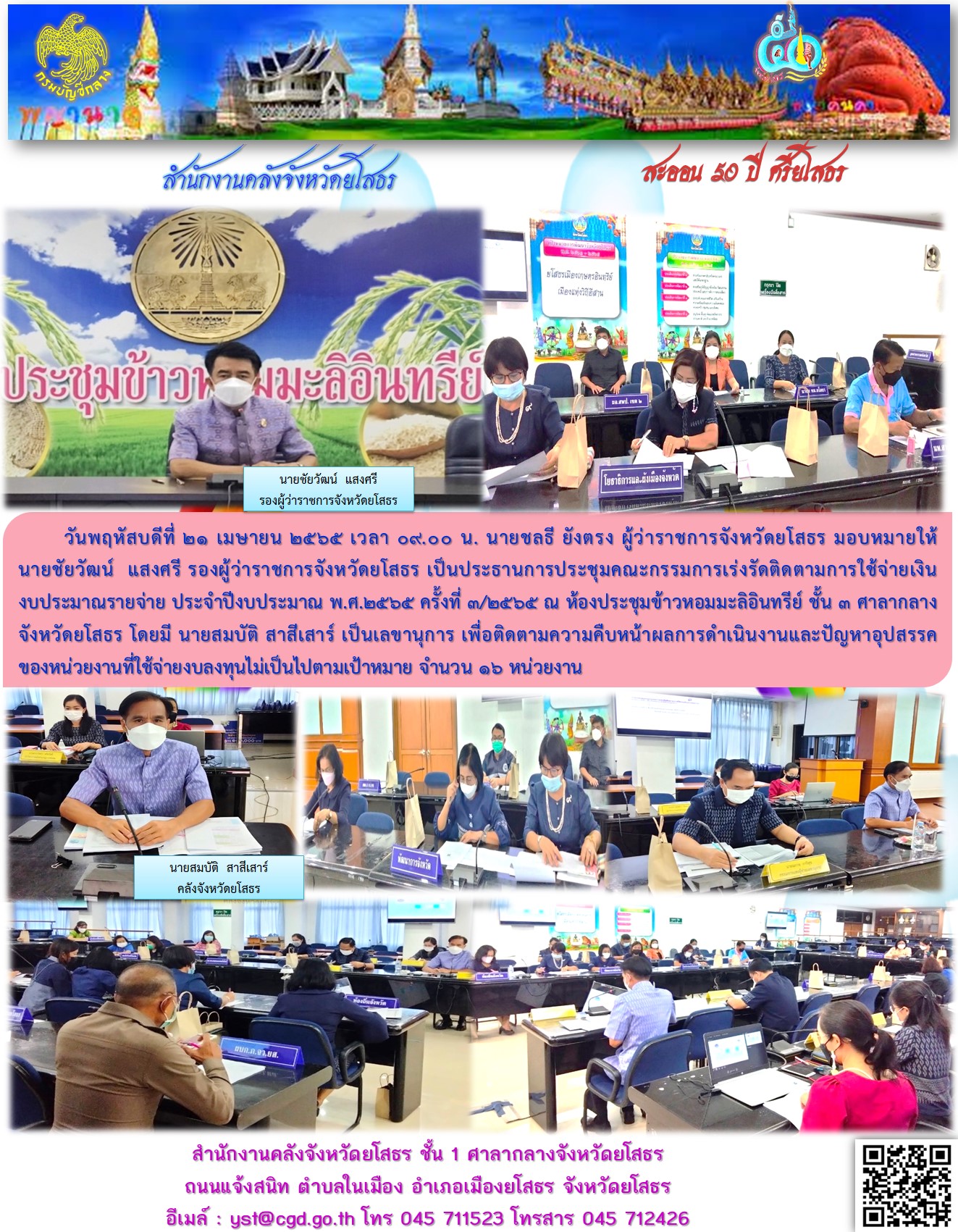วันที่ 21 เม.ย. 2565 (20:33 น.)วันพฤหัสบดีที่ 21 เมษายน 2565 เวลา 09.00 น. นายชลธี ยังตรง ผู้ว่าราชการจังหวัดยโสธร มอบหมายให้นายชัยวัฒน์ แสงศรี รองผู้ว่าราชการจังหวัดยโสธร เป็นประธานการประชุมคณะกรรมการเร่งรัดติดตามการใช้จ่ายเงินงบประมาณรายจ่าย ประจำปีงบประมาณ พ.ศ.2565 ครั้งที่ 3/2565 ณ ห้องประชุมข้าวหอมมะลิอินทรีย์ ชั้น 3 ศาลากลางจังหวัดยโสธร โดยมี นายสมบัติ สาสีเสาร์ เป็นเลขานุการ เพื่อติดตามความคืบหน้าผลการดำเนินงานและปัญหาอุปสรรคของหน่วยงานที่ใช้จ่ายงบลงทุนไม่เป็นไปตามเป้าหมาย จำนวน 16 หน่วยงาน