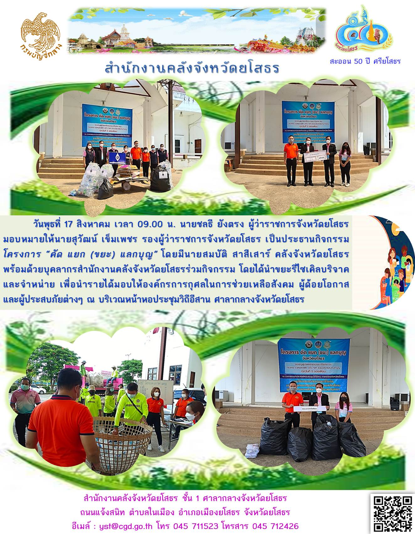 วันพุธที่ 17 สิงหาคม เวลา 09.00 น. นายชลธี ยังตรง ผู้ว่าราชการจังหวัดยโสธร มอบหมายให้นายสุวัฒน์ เข็มเพชร รองผู้ว่าราชการจังหวัดยโสธร เป็นประธานกิจกรรม โครงการ “คัด แยก (ขยะ) แลกบุญ” โดยมีนายสมบัติ สาสีเสาร์ คลังจังหวัดยโสธร พร้อมด้วยบุคลากรสำน