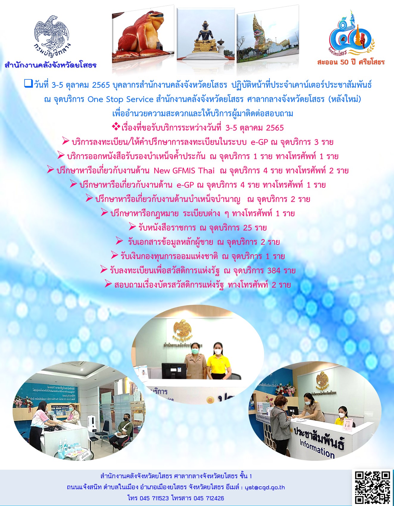วันที่ 3-5 ตุลาคม 2565 บุคลากรสำนักงานคลังจังหวัดยโสธร ปฏิบัติหน้าที่ประจำเคาน์เตอร์ประชาสัมพันธ์ ณ จุดบริการ One Stop Service สำนักงานคลังจังหวัดยโสธร ศาลากลางจังหวัดยโสธร (หลังใหม่) เพื่ออำนวยความสะดวกและให้บริการผู้มาติดต่อสอบถาม