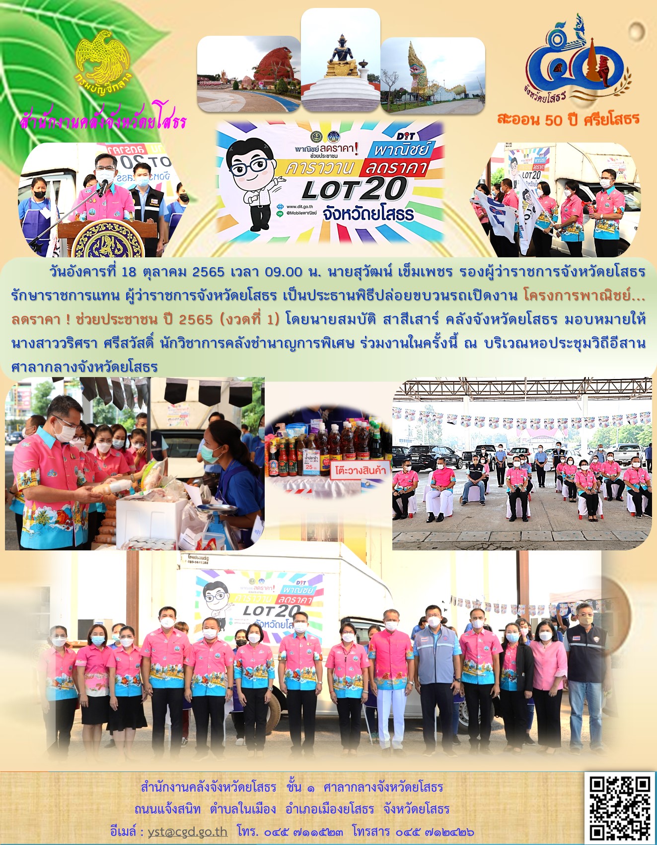 วันอังคารที่ 18 ตุลาคม 2565 เวลา 09.00 น. นายสุวัฒน์ เข็มเพชร รองผู้ว่าราชการจังหวัดยโสธร รักษาราชการแทน ผู้ว่าราชการจังหวัดยโสธร เป็นประธานพิธีปล่อยขบวนรถเปิดงาน โครงการพาณิชย์... ลดราคา ! ช่วยประชาชน ปี 2565 (งวดที่ 1) โดยนายสมบัติ สาสีเสาร์ คลังจ