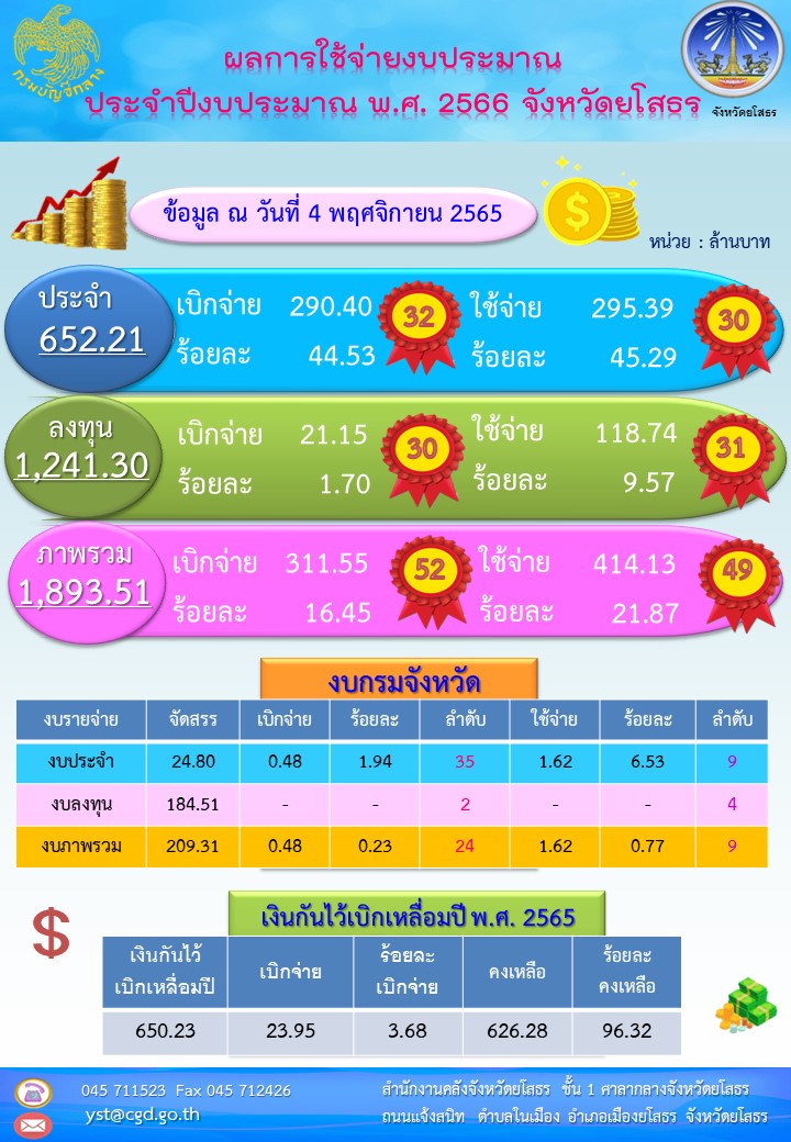 วันที่ 9 พ.ย. 2565 (11:45 น.)ผลการใช้จ่ายงบประมาณของจังหวัดยโสธร ข้อมูล ณ วันที่ 4 พฤศจิกายน 2565