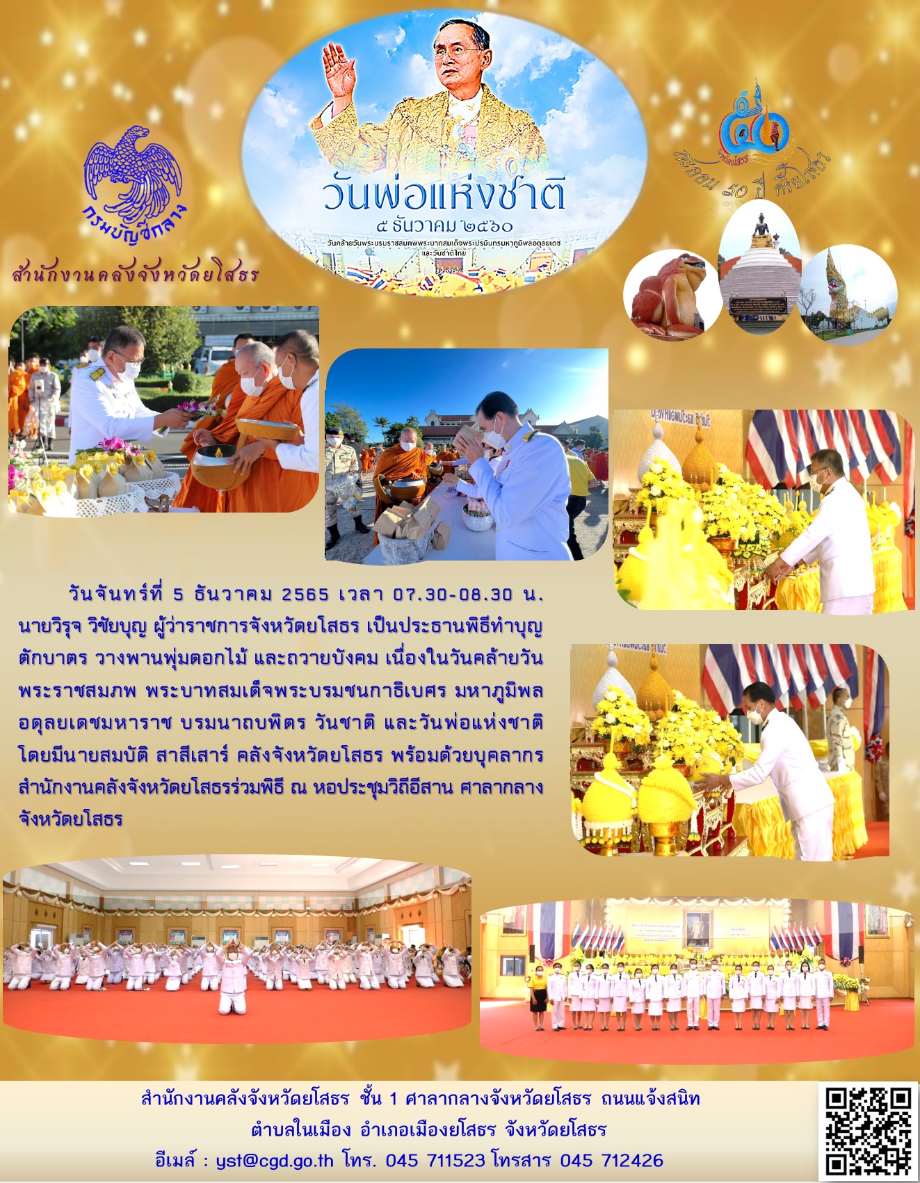 วันจันทร์ที่ 5 ธันวาคม 2565 เวลา 07.30-08.30 น. นายวิรุจ วิชัยบุญ ผู้ว่าราชการจังหวัดยโสธร เป็นประธานพิธีทำบุญ ตักบาตร วางพานพุ่มดอกไม้ และถวายบังคม เนื่องในวันคล้ายวัน พระราชสมภพ พระบาทสมเด็จพระบรมชนกาธิเบศร มหาภูมิพล อดุลยเดช