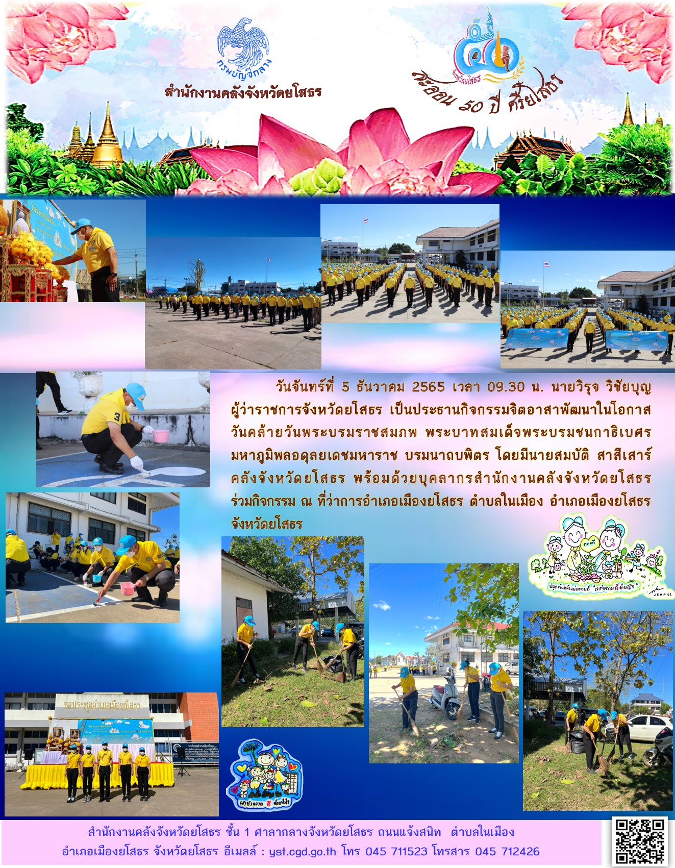 วันจันทร์ที่ 5 ธันวาคม 2565 เวลา 09.30 น. นายวิรุจ วิชัยบุญ ผู้ว่าราชการจังหวัดยโสธร เป็นประธานกิจกรรมจิตอาสาพัฒนาในโอกาส วันคล้ายวันพระบรมราชสมภพ พระบาทสมเด็จพระบรมชนกาธิเบศร มหาภูมิพลอดุลยเดชมหาราช บรมนาถบพิตร โดยมีนายสมบัติ สาสีเสาร์ คลัง