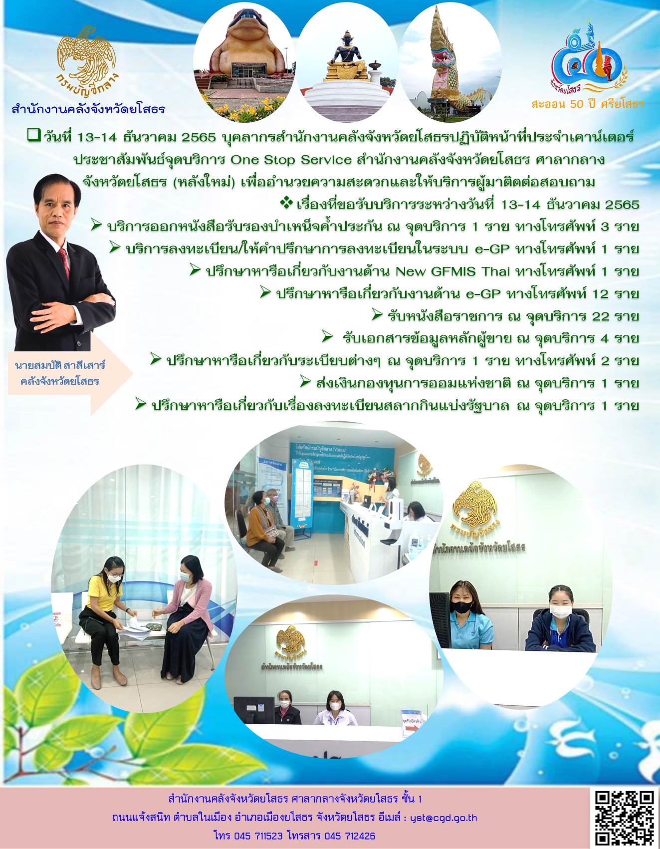 วันที่ 15 ธ.ค. 2565 (09:39 น.)qวันที่ 13-14 ธันวาคม 2565 บุคลากรสำนักงานคลังจังหวัดยโสธรปฏิบัติหน้าที่ประจำเคาน์เตอร์ประชาสัมพันธ์จุดบริการ One Stop Service สำนักงานคลังจังหวัดยโสธร ศาลากลาง จังหวัดยโสธร (หลังใหม่) เพื่ออำนวยความสะดวกและให้บริการผู้มาติดต่อสอบถาม