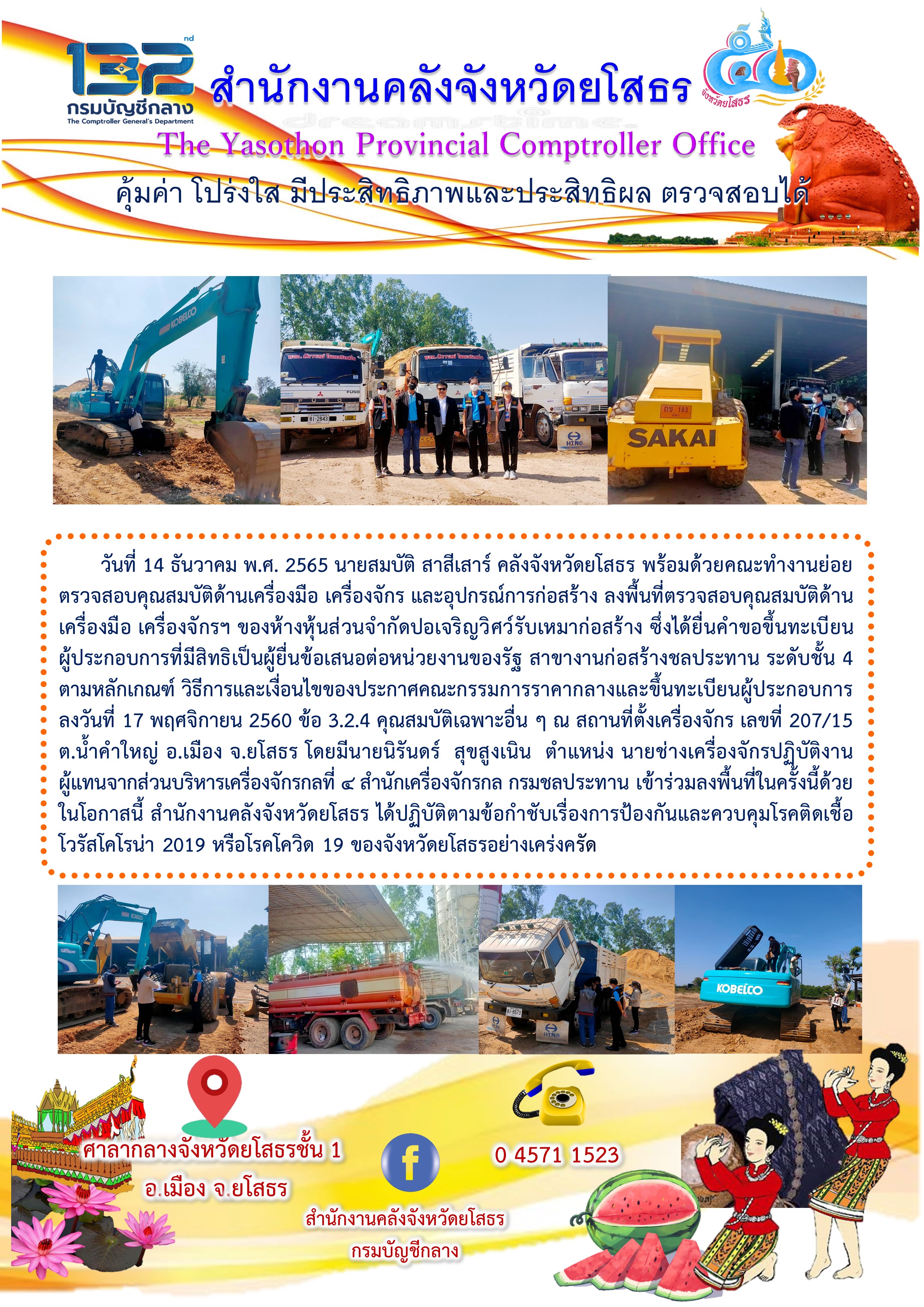 วันที่ 14 ธันวาคม พ.ศ. 2565 นายสมบัติ สาสีเสาร์ คลังจังหวัดยโสธร พร้อมด้วยคณะทำงานย่อยตรวจสอบคุณสมบัติด้านเครื่องมือ เครื่องจักร และอุปกรณ์การก่อสร้าง ลงพื้นที่ตรวจสอบคุณสมบัติด้านเครื่องมือ เครื่องจักรฯ ของห้างหุ้นส่วนจำกัดปอเจริญวิศว์รับเหมาก่อสร้า