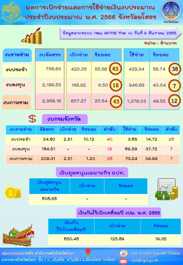 วันที่ 15 ธ.ค. 2565 (10:46 น.)ผลการใช้จ่ายงบประมาณของจังหวัดยโสธร ข้อมูล ณ วันที่ 9 ธันวาคม 2565