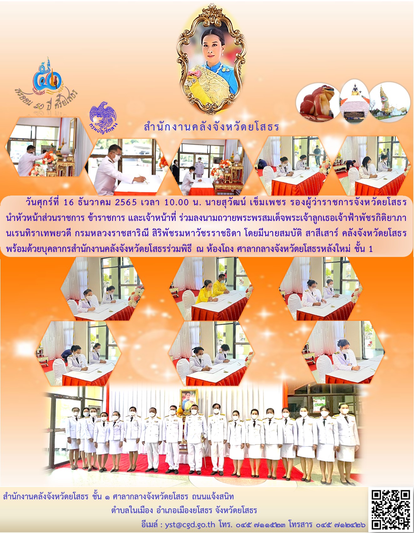 วันศุกร์ที่ 16 ธันวาคม 2565 เวลา 10.00 น. นายสุวัฒน์ เข็มเพชร รองผู้ว่าราชการจังหวัดยโสธร นำหัวหน้าส่วนราชการ ข้าราชการ และเจ้าหน้าที่ ร่วมลงนามถวายพระพรสมเด็จพระเจ้าลูกเธอเจ้าฟ้าพัชรกิติยาภา นเรนทิราเทพยวดี กรมหลวงราชสาริณี สิร