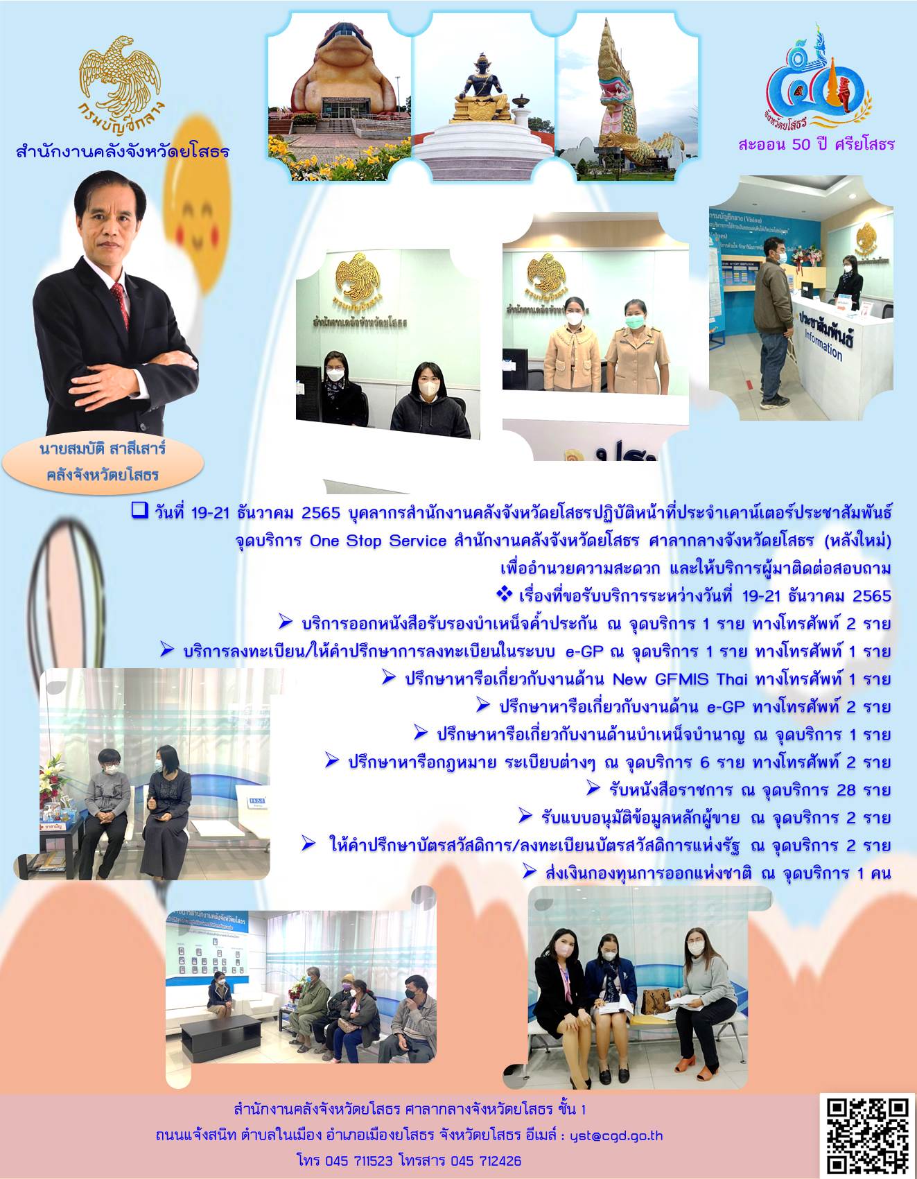 วันที่ 19-21 ธันวาคม 2565 บุคลากรสำนักงานคลังจังหวัดยโสธรปฏิบัติหน้าที่ประจำเคาน์เตอร์ประชาสัมพันธ์ จุดบริการ One Stop Service สำนักงานคลังจังหวัดยโสธร ศาลากลางจังหวัดยโสธร (หลังใหม่) เพื่ออำนวยความสะดวก และให้บริการผู้มาติดต่อสอบถาม vเรื่องที่ขอรับ