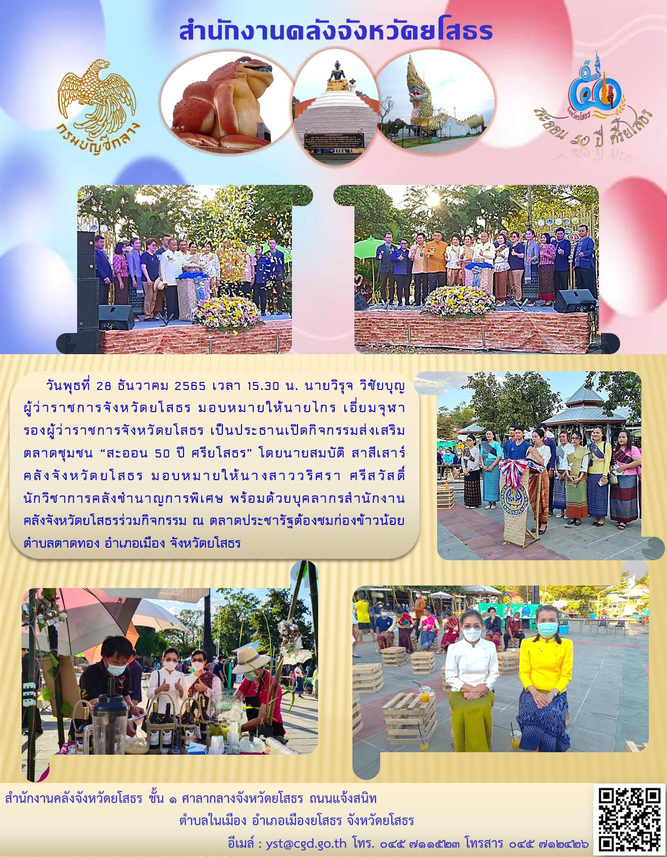 วันพุธที่ 28 ธันวาคม 2565 เวลา 15.30 น. นายวิรุจ วิชัยบุญ ผู้ว่าราชการจังหวัดยโสธร มอบหมายให้นายไกร เอี่ยมจุฬา รองผู้ว่าราชการจังหวัดยโสธร เป็นประธานเปิดกิจกรรมส่งเสริม ตลาดชุมชน “สะออน 50 ปี ศรียโสธร” โดยนายสมบัติ สาสีเสาร์ คลังจังหวัดยโสธร มอบห