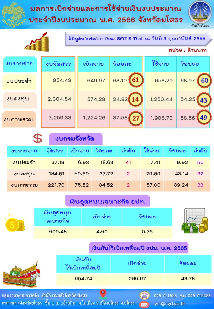 รายงานผลการเบิกจ่ายและใช้จ่ายเงินงบประมาณของจังหวัดยโสธร ข้อมูล ณ วันที่ 3 กุมภาพันธ์ 2566