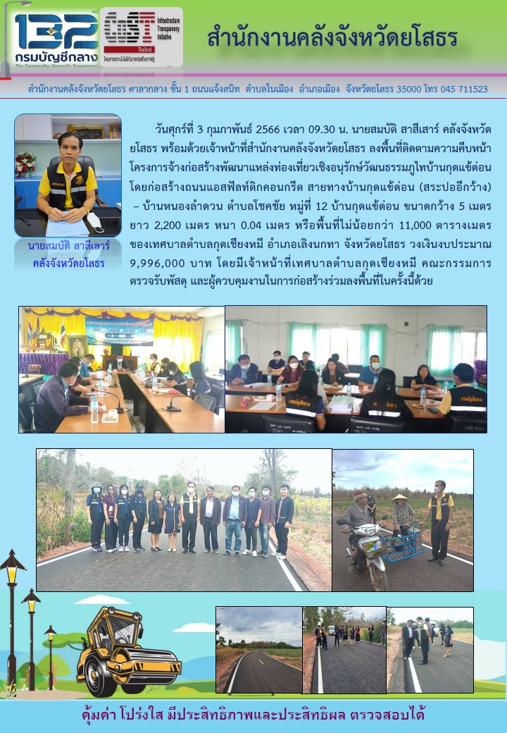 วันศุกร์ที่ 3 กุมภาพันธ์ 2566 เวลา 09.30 น. นายสมบัติ สาสีเสาร์ คลังจังหวัดยโสธร พร้อมด้วยเจ้าหน้าที่สำนักงานคลังจังหวัดยโสธร ลงพื้นที่ติดตามความคืบหน้าโครงการจ้างก่อสร้างพัฒนาแหล่งท่องเที่ยวเชิงอนุรักษ์วัฒนธรรมภูไทบ้านกุดแข้ด่อน โดยก่อสร้างถนนแอสฟัล