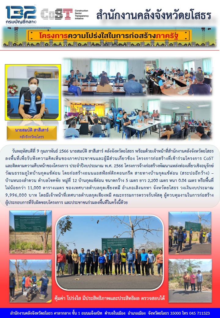 วันพฤหัสบดีที่ 9 กุมภาพันธ์ 2566 นายสมบัติ สาสีเสาร์ คลังจังหวัดยโสธร พร้อมด้วยเจ้าหน้าที่สำนักงานคลังจังหวัดยโสธร ลงพื้นที่เพื่อรับฟังความคิดเห็นของภาคประชาชนและผู้มีส่วนเกี่ยวข้อง โครงการก่อสร้างที่เข้าร่วมโครงการ CoST และติดตามความคืบหน้าของโครงกา