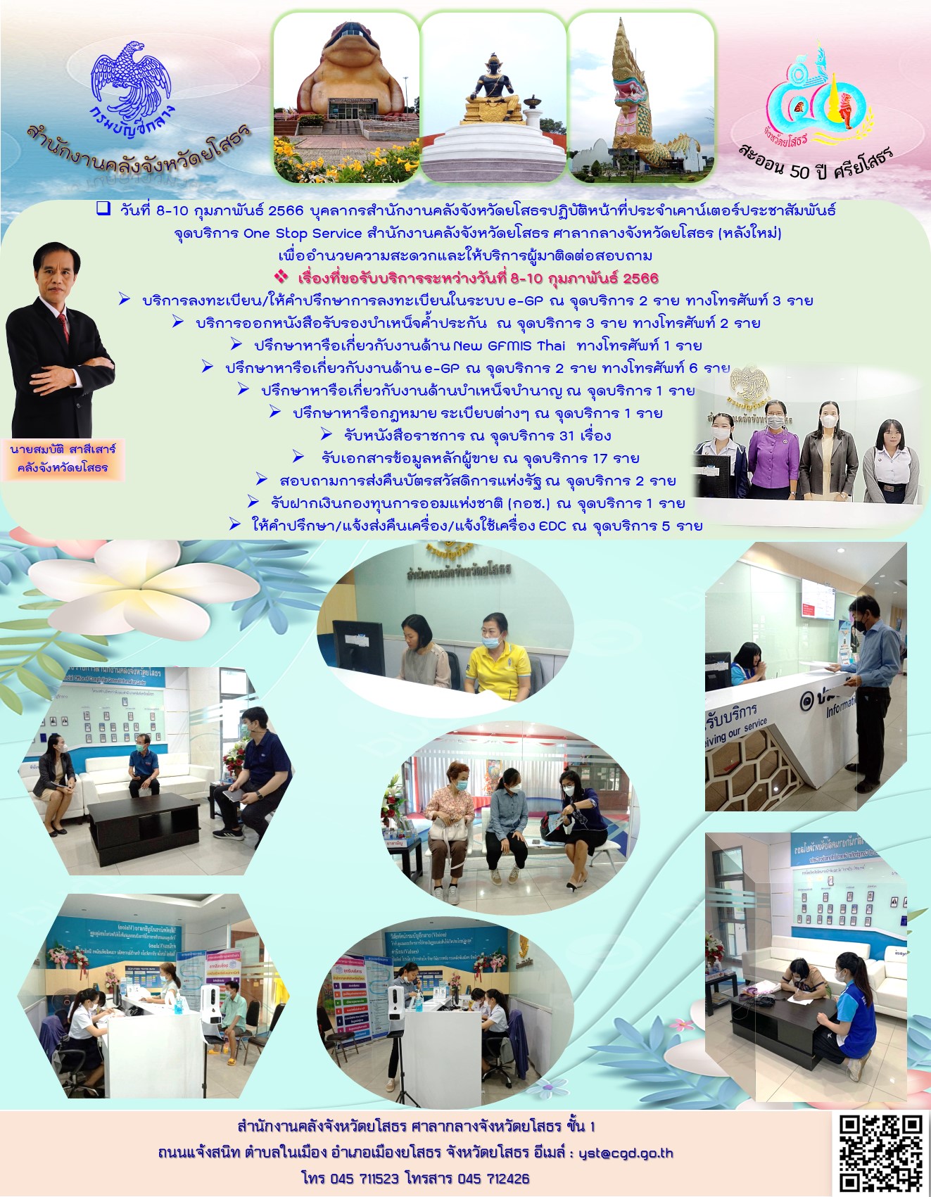 วันที่ 8-10 กุมภาพันธ์ 2566 บุคลากรสำนักงานคลังจังหวัดยโสธรปฏิบัติหน้าที่ประจำเคาน์เตอร์ประชาสัมพันธ์จุดบริการ One Stop Service สำนักงานคลังจังหวัดยโสธร ศาลากลางจังหวัดยโสธร (หลังใหม่) เพื่ออำนวยความสะดวกและให้บริการผู้มาติดต่อสอบถาม