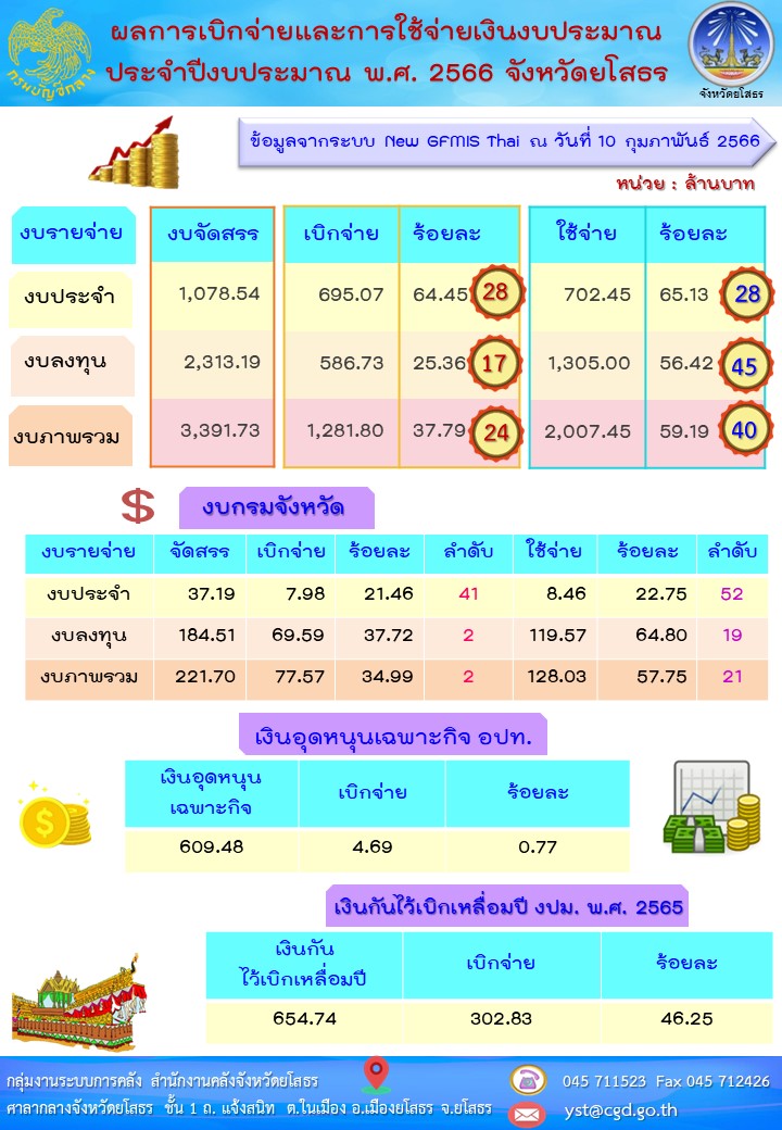 รายงานผลการเบิกจ่ายและใช้จ่ายเงินงบประมาณของจังหวัดยโสธร ข้อมูล ณ วันที่ 10 กุมภาพันธ์ 2566