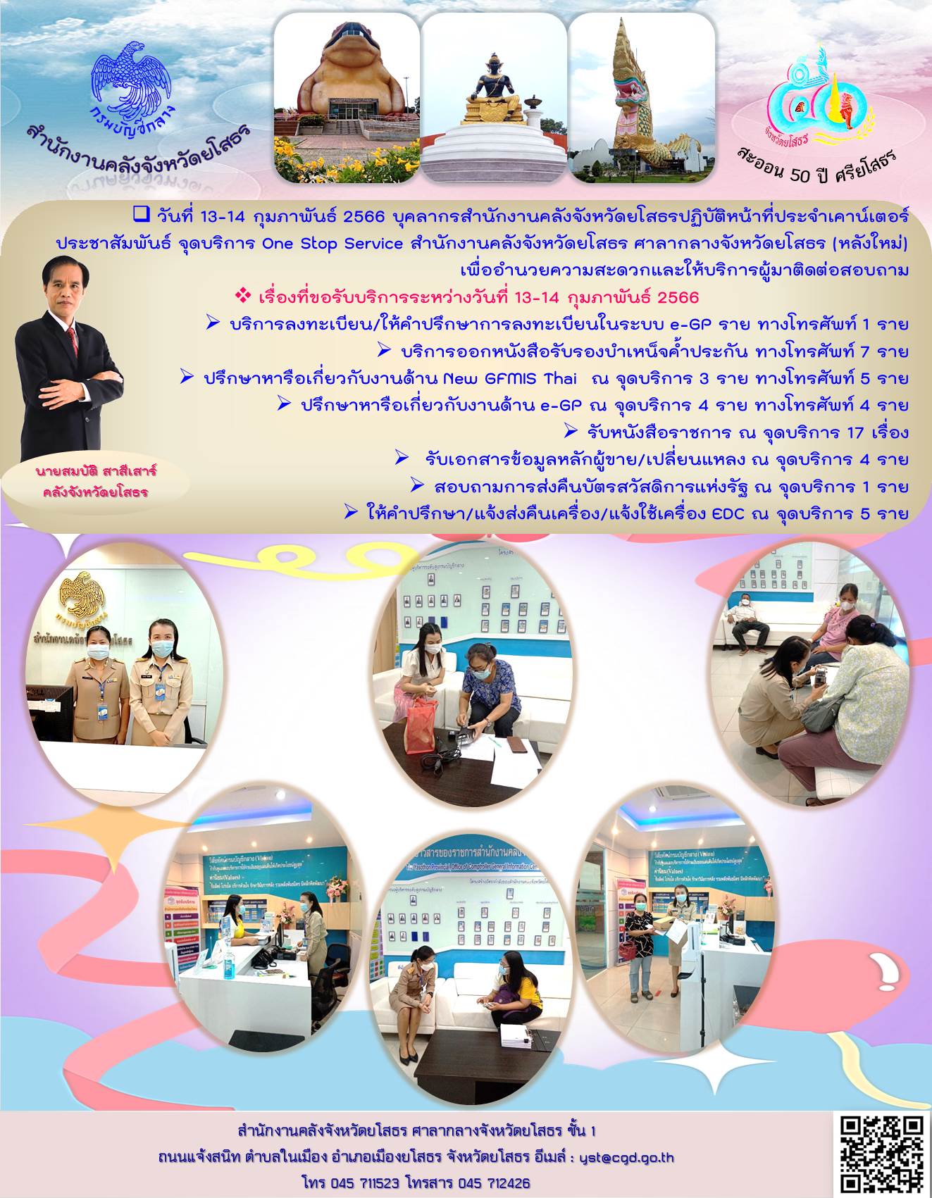 วันที่ 13-14 กุมภาพันธ์ 2566 บุคลากรสำนักงานคลังจังหวัดยโสธรปฏิบัติหน้าที่ประจำเคาน์เตอร์ประชาสัมพันธ์ จุดบริการ One Stop Service สำนักงานคลังจังหวัดยโสธร ศาลากลางจังหวัดยโสธร (หลังใหม่) เพื่ออำนวยความสะดวกและให้บริการผู้มาติดต่อสอบถาม