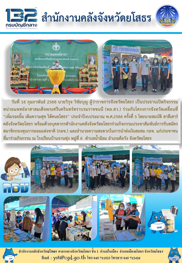 วันที่ 22 ก.พ. 2566 (09:21 น.)วันที่ 16 กุมภาพันธ์ 2566 นายวิรุจ วิชัยบุญ ผู้ว่าราชการจังหวัดยโสธร เป็นประธานเปิดกิจกรรมหน่วยแพทย์อาสาสมเด็จพระศรีนครินทร์ทราบรมราชชนนี (พอ.สว.) ร่วมกับโครงการจังหวัดเคลื่อนที่ “เพิ่มรอยยิ้ม เติมความสุข ให้คนยโสธร” ประจำปีงบประมาณ พ.ศ.2566 ครั้งที่ 5 โดยนายสมบัติ สาสีเสาร์ คลังจังหวัดยโสธร พร้อมด้วยบุคลากรสำนักงานคลังจังหวัดยโสธรร่วมกิจกรรมประชาสัมพันธ์การรับสมัครสมาชิกกองทุนการออมแห่งชาติ (กอช.) และอำนวยความสะดวกในการนำส่งเงินสะสม กอช. แก่ประชาชนที่มาร่วมกิจกรรม ณ โรงเรียนบ้านจานทุ่ง หมู่ที่ 6 ตำบลน้ำอ้อม อำเภอค้อวัง จังหวัดยโสธร