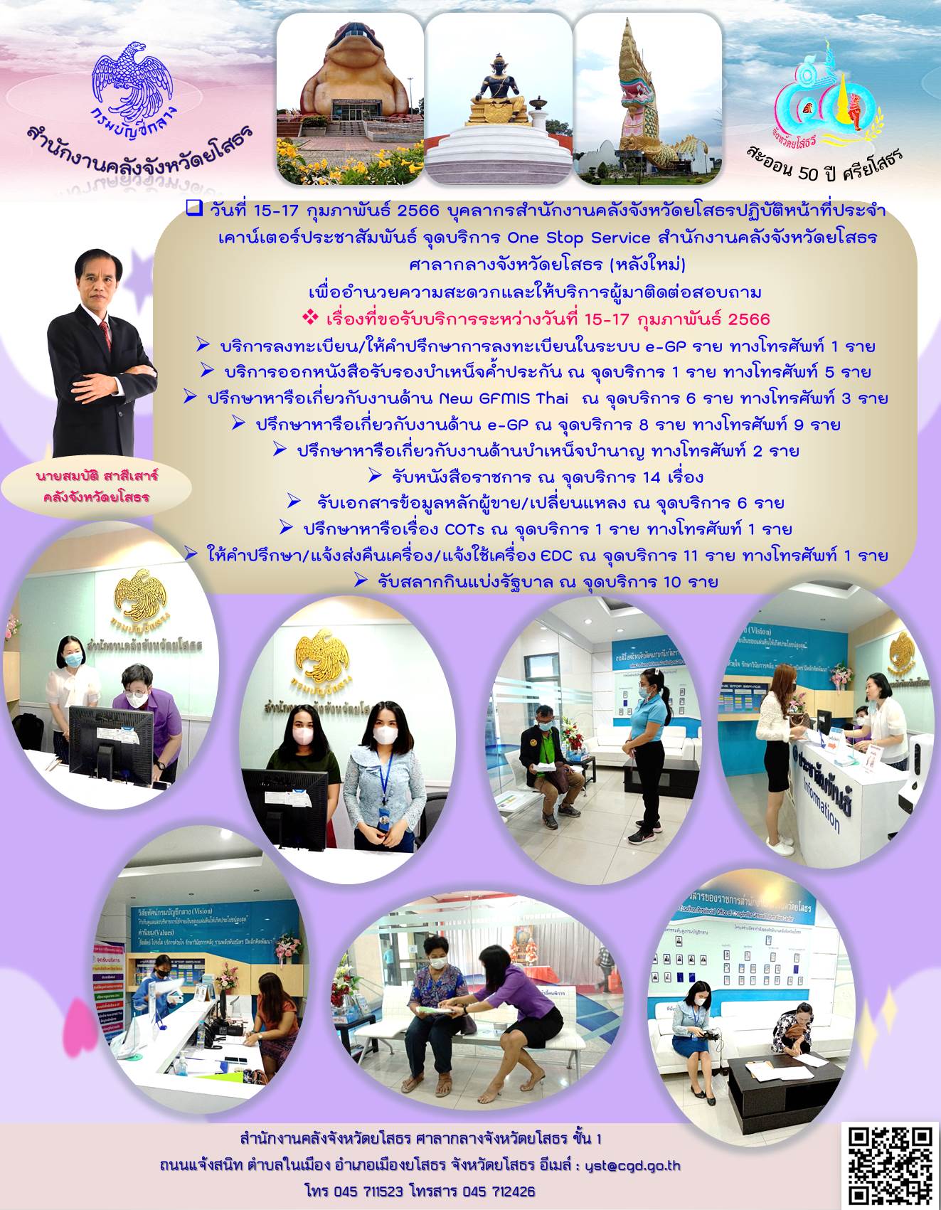 วันที่ 15-17 กุมภาพันธ์ 2566 บุคลากรสำนักงานคลังจังหวัดยโสธรปฏิบัติหน้าที่ประจำเคาน์เตอร์ประชาสัมพันธ์ จุดบริการ One Stop Service สำนักงานคลังจังหวัดยโสธร ศาลากลางจังหวัดยโสธร (หลังใหม่)
