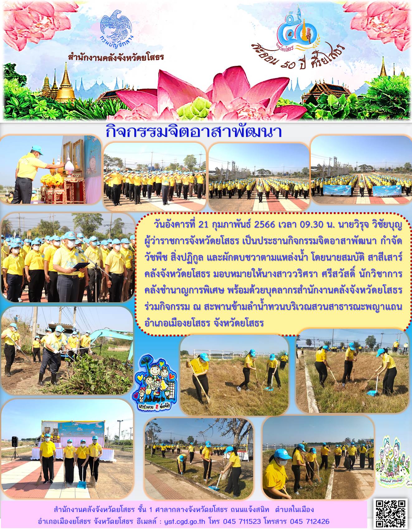วันอังคารที่ 21 กุมภาพันธ์ 2566 เวลา 09.30 น. นายวิรุจ วิชัยบุญ ผู้ว่าราชการจังหวัดยโสธร เป็นประธานกิจกรรมจิตอาสาพัฒนา กำจัดวัชพืช สิ่งปฏิกูล และผักตบชวาตามแหล่งน้ำ โดยนายสมบัติ สาสีเสาร์ คลังจังหวัดยโสธร มอบหมายให้นางสาววริศรา ศรีสวัสดิ์ นักวิชาการค