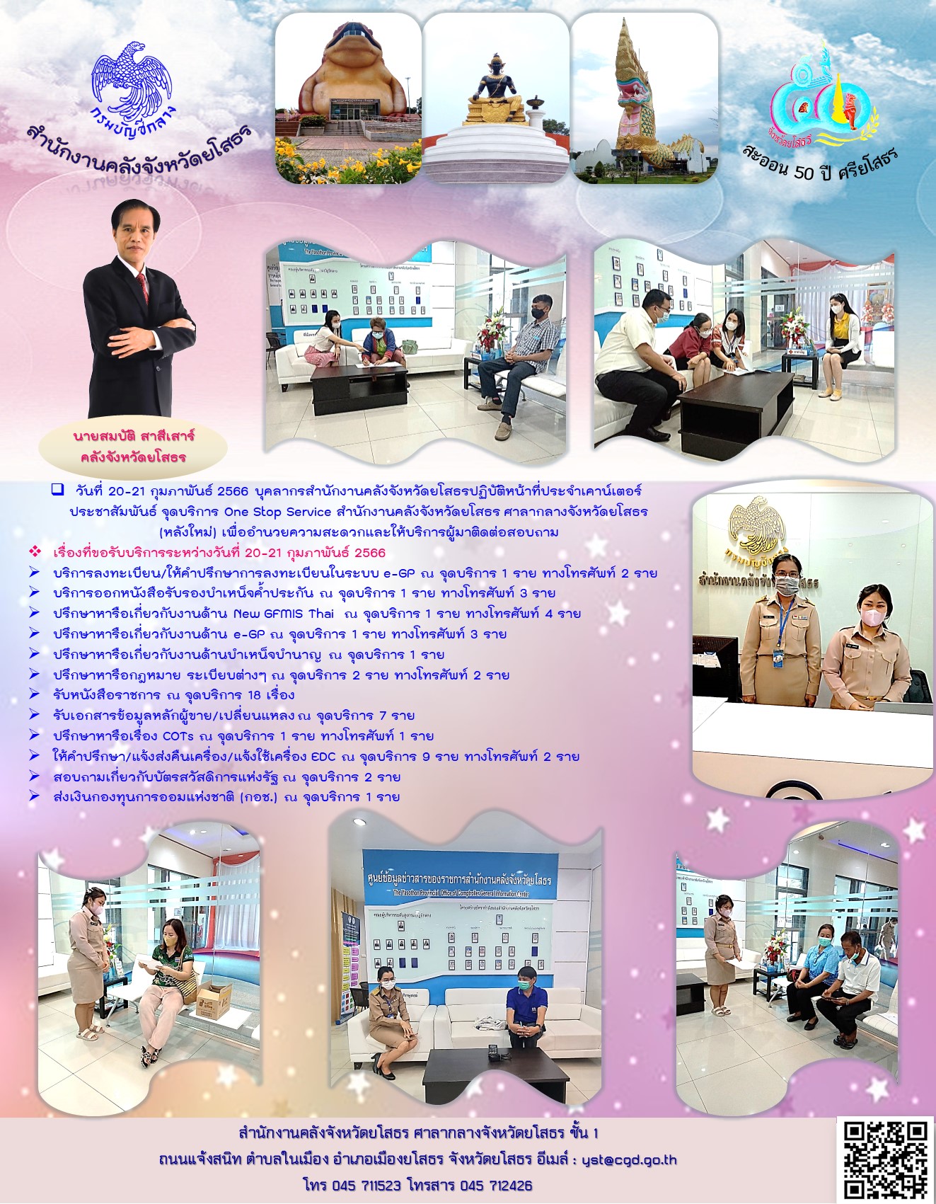 วันที่ 20-21 กุมภาพันธ์ 2566 บุคลากรสำนักงานคลังจังหวัดยโสธรปฏิบัติหน้าที่ประจำเคาน์เตอร์ประชาสัมพันธ์ จุดบริการ One Stop Service สำนักงานคลังจังหวัดยโสธร ศาลากลางจังหวัดยโสธร (หลังใหม่) เพื่ออำนวยความสะดวกและให้บริการผู้มาติดต่อสอบถาม