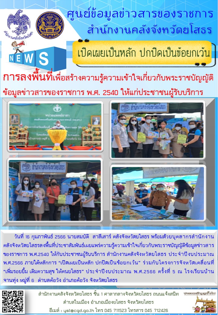 วันที่ 16 กุมภาพันธ์ 2566 นายสมบัติ สาสีเสาร์ คลังจังหวัดยโสธร พร้อมด้วยบุคลากรสำนักงาน คลังจังหวัดยโสธรลงพื้นที่ประชาสัมพันธ์เผยแพร่ความรู้ความเข้าใจเกี่ยวกับพระราชบัญญัติข้อมูลข่าวสารของราชการ พ.ศ.2540 ให้กับประชาชนผู้รับบริการ สำ