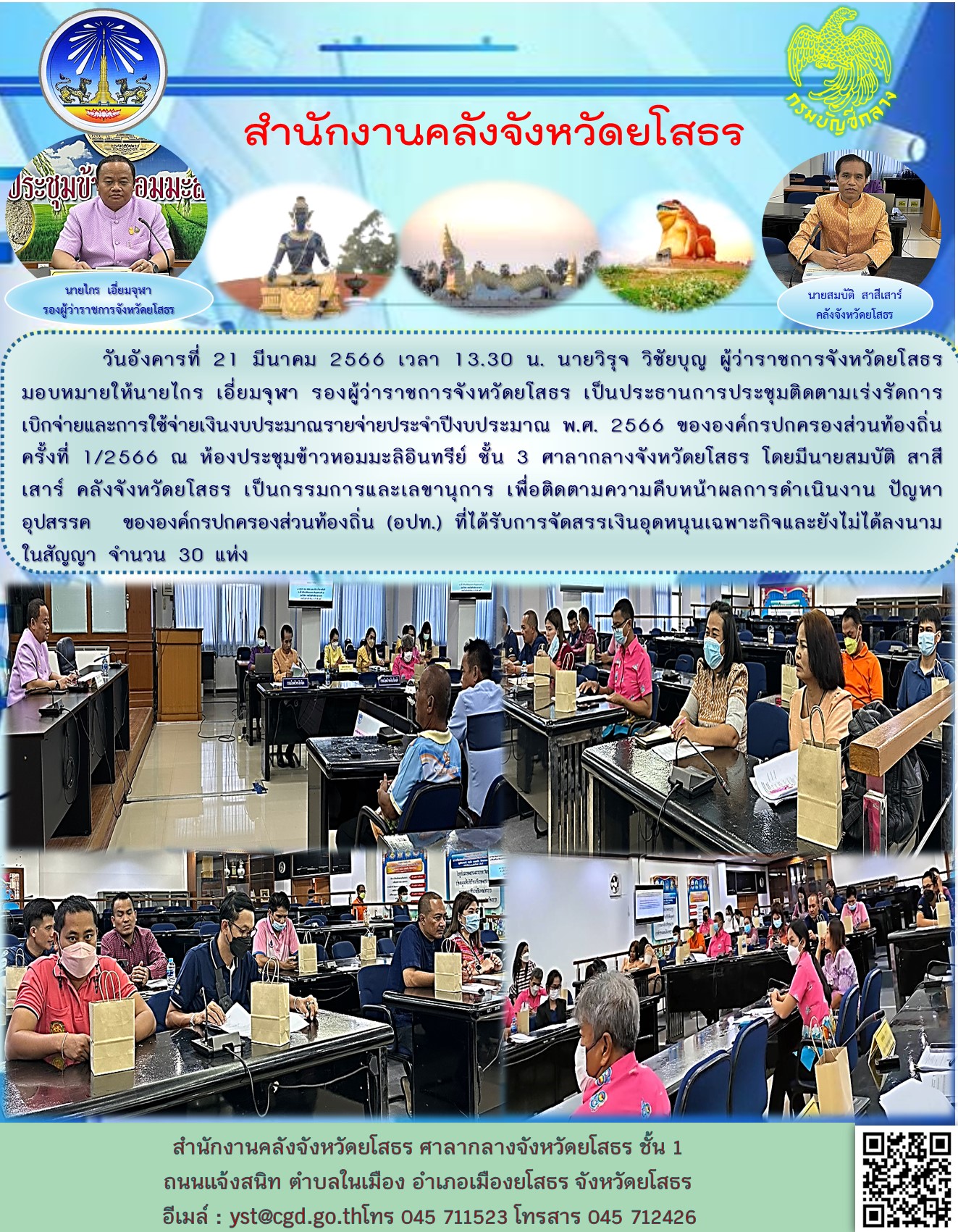 วันอังคารที่ 21 มีนาคม 2566 เวลา 13.30 น. นายวิรุจ วิชัยบุญ ผู้ว่าราชการจังหวัดยโสธร มอบหมายให้นายไกร เอี่ยมจุฬา รองผู้ว่าราชการจังหวัดยโสธร เป็นประธานการประชุมติดตามเร่งรัดการเบิกจ่ายและการใช้จ่ายเงินงบประมาณรายจ่ายประจำปีงบประมาณ พ.ศ. 2566 ของ