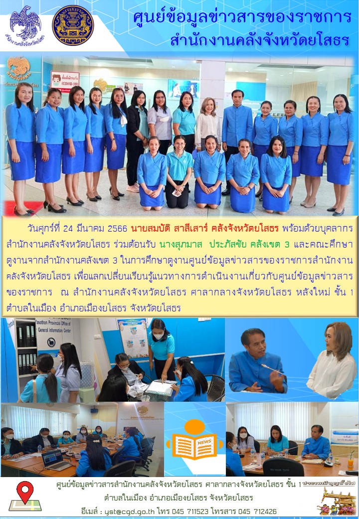วันที่ 25 มี.ค. 2566 (14:20 น.)วันศุกร์ที่ 24 มีนาคม 2566 นายสมบัติ สาสีเสาร์ คลังจังหวัดยโสธร พร้อมด้วยบุคลากรสำนักงานคลังจังหวัดยโสธร ร่วมต้อนรับ นางสุภมาส ประภัสชัย คลังเขต 3 และคณะศึกษาดูงานจากสำนักงานคลังเขต 3 ในการศึกษาดูงานศูนย์ข้อมูลข่าวสารของราชการสำนักงาน คลังจังหวัดยโสธร เพื่อแลกเปลี่ยนเรียนรู้แนวทางการดำเนินงานเกี่ยวกับศูนย์ข้อมูลข่าวสาร