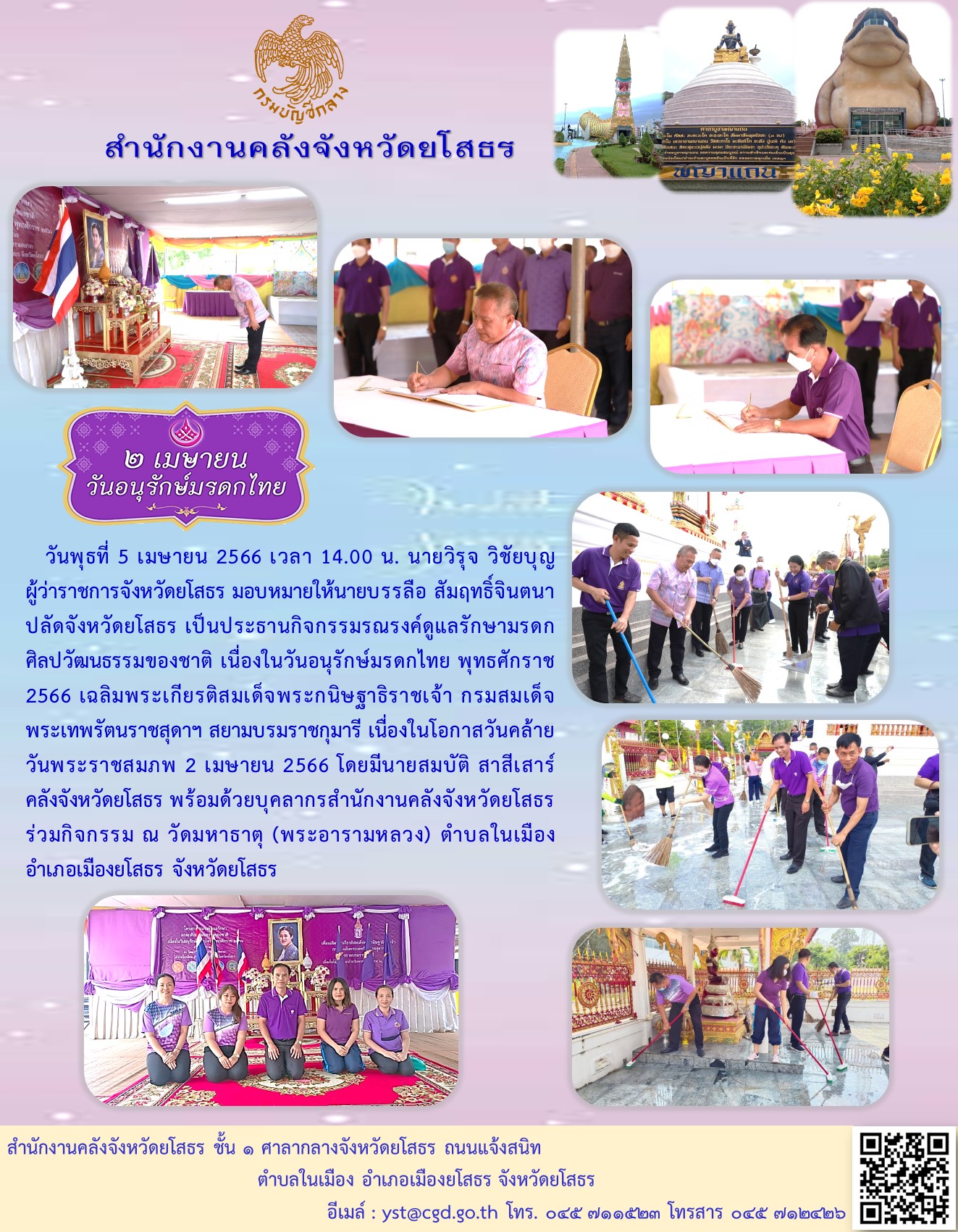วันพุธที่ 5 เมษายน 2566 เวลา 14.00 น. นายวิรุจ วิชัยบุญ ผู้ว่าราชการจังหวัดยโสธร มอบหมายให้นายบรรลือ สัมฤทธิ์จินตนา ปลัดจังหวัดยโสธร เป็นประธานกิจกรรมรณรงค์ดูแลรักษามรดกศิลปวัฒนธรรมของชาติ เนื่องในวันอนุรักษ์มรดกไทย พุทธศักราช 2566 เฉลิมพระเกียรติสม