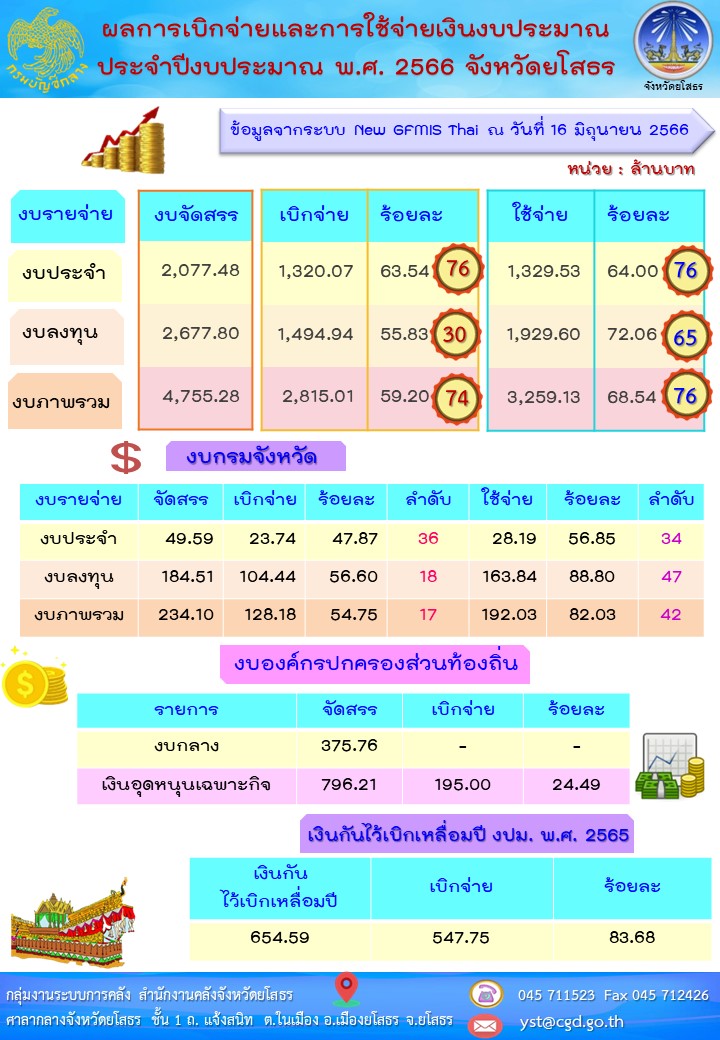 รายงานผลการเบิกจ่ายและใช้จ่ายเงินงบประมาณของจังหวัดยโสธร ข้อมูล ณ วันที่ 16 มิถุนายน 2566 สามารถดูได้ตาม (thumbtack) ระบบติดตามสถานะการใช้จ่ายงบประมาณของจังหวัดยโสธร http://yst-cgd.com/