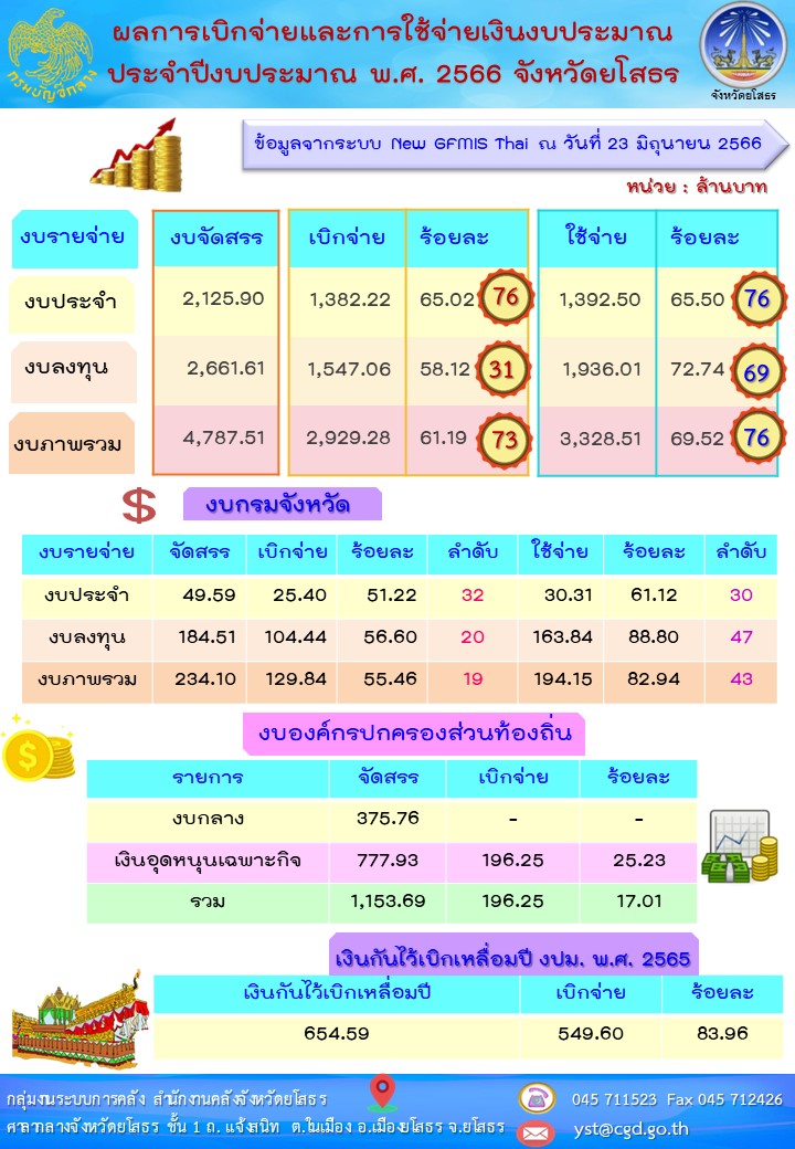 รายงานผลการเบิกจ่ายและใช้จ่ายเงินงบประมาณของจังหวัดยโสธร ข้อมูล ณ วันที่ 23 มิถุนายน 2566 สามารถดูได้ตาม (thumbtack) ระบบติดตามสถานะการใช้จ่ายงบประมาณของจังหวัดยโสธร http://yst-cgd.com/