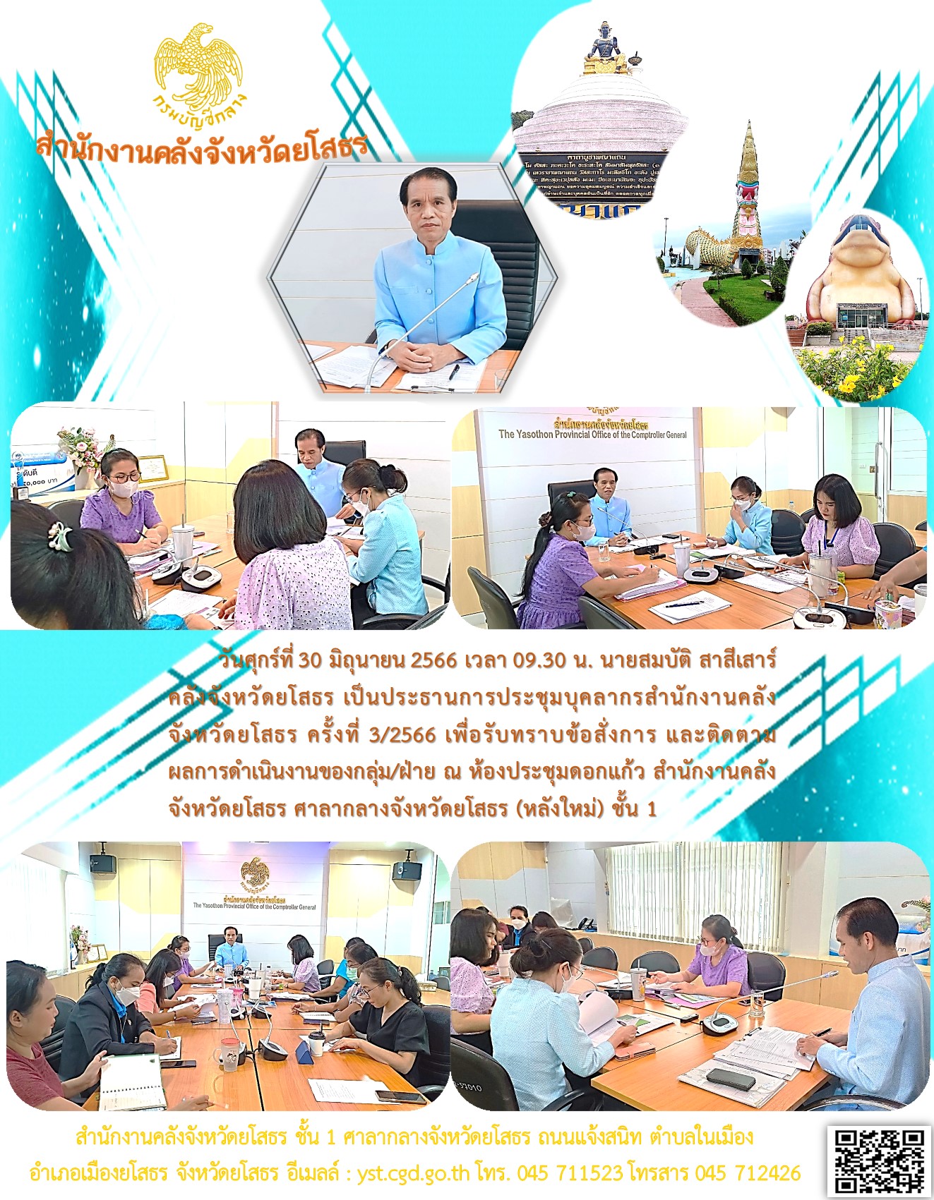วันศุกร์ที่ 30 มิถุนายน 2566 เวลา 09.30 น. นายสมบัติ สาสีเสาร์ คลังจังหวัดยโสธร เป็นประธานการประชุมบุคลากรสำนักงานคลัง จังหวัดยโสธร ครั้งที่ 3/2566 เพื่อรับทราบข้อสั่งการ และติดตาม ผลการดำเนินงานของกลุ่ม/ฝ่าย ณ ห้องประชุมดอกแก้ว สำนักง