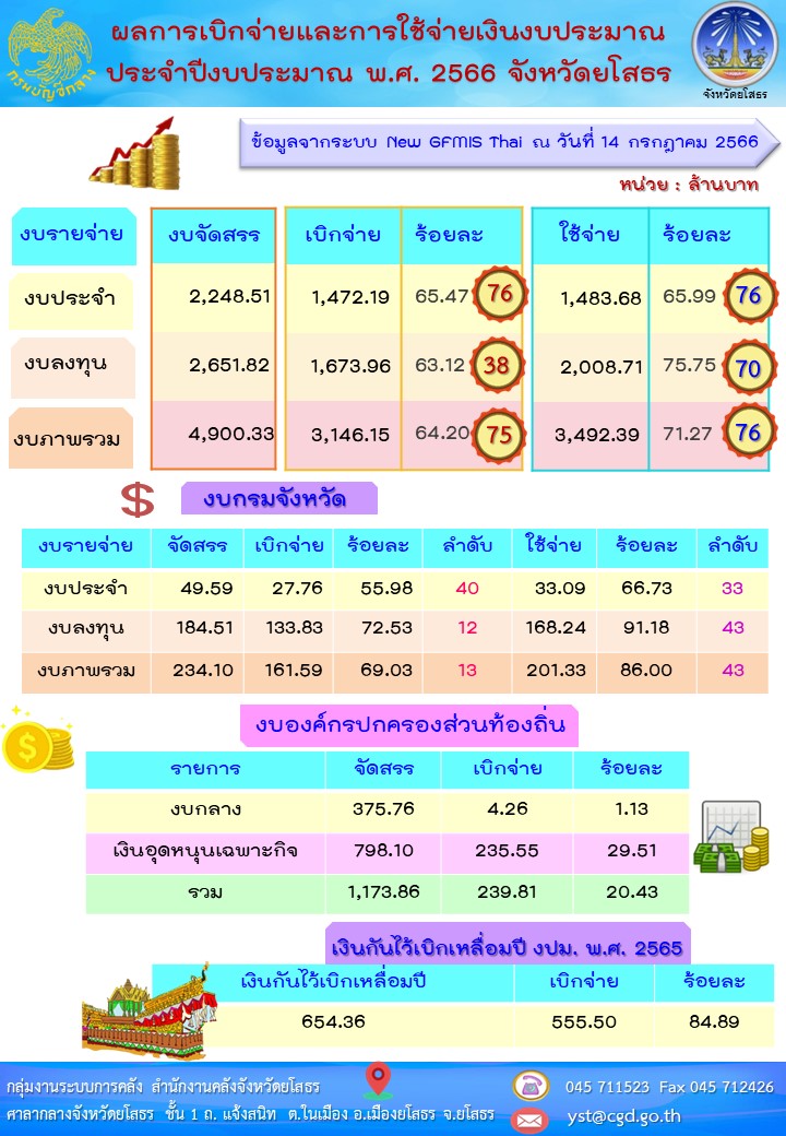 รายงานผลการเบิกจ่ายและใช้จ่ายเงินงบประมาณของจังหวัดยโสธร ข้อมูล ณ วันที่ 14 กรกฎาคม 2566 สามารถดูได้ตาม (thumbtack) ระบบติดตามสถานะการใช้จ่ายงบประมาณของจังหวัดยโสธร http://yst-cgd.com/