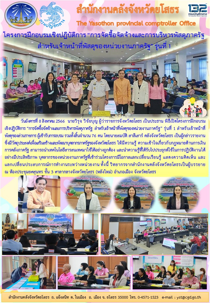 วันอังคารที่ 8 สิงหาคม 2566 นายวิรุจ วิชัยบุญ ผู้ว่าราชการจังหวัดยโสธร เป็นประธาน พิธีเปิดโครงการฝึกอบรม เชิงปฏิบัติการ “การจัดซื้อจัดจ้างและการบริหารพัสดุภาครัฐ สำหรับเจ้าหน้าที่พัสดุของหน่วยงานภาครัฐ” รุ่นที่ 1 สำหรับเจ้าหน้าที่พัสดุของส่วนร