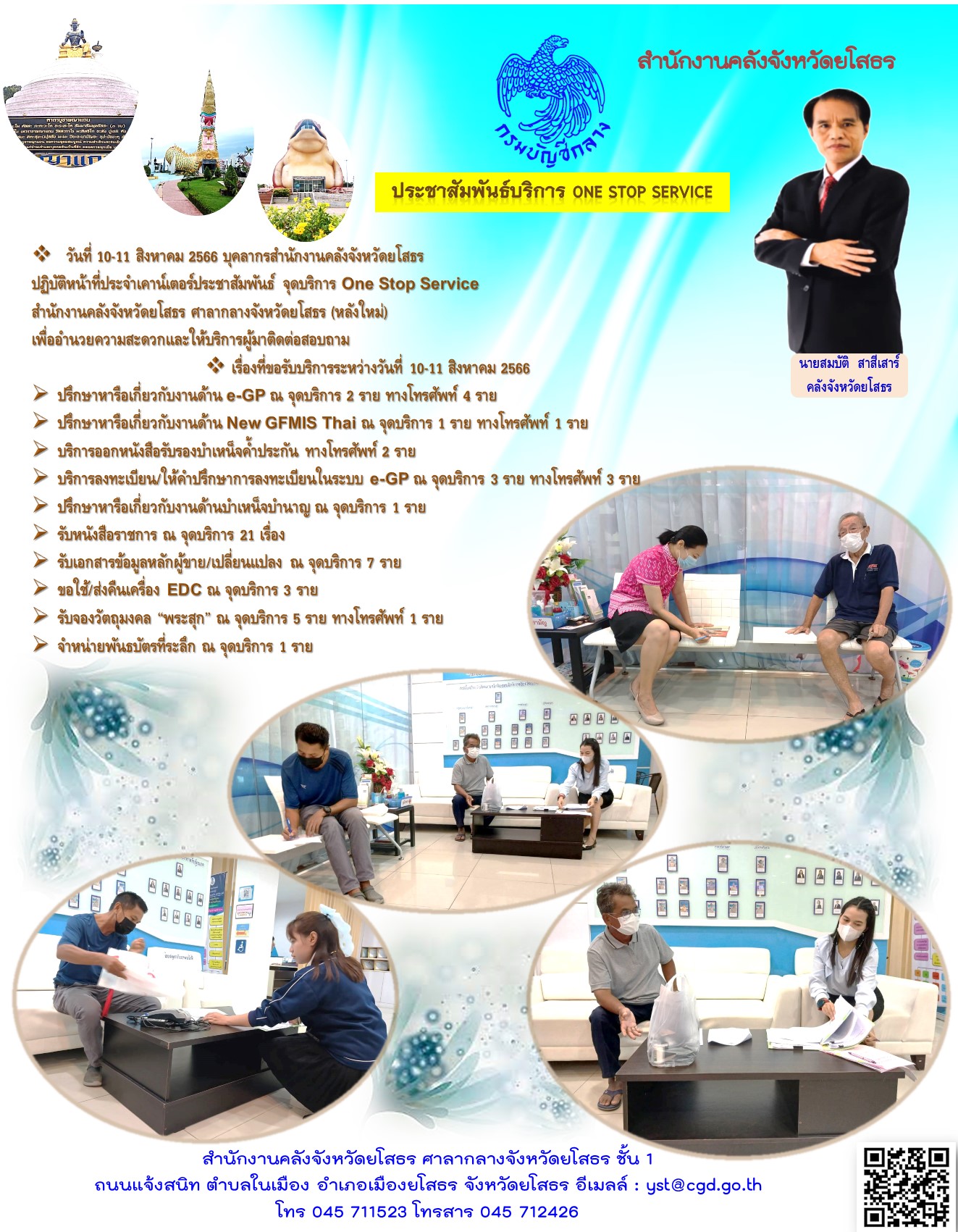 วันที่ 10-11 สิงหาคม 2566 บุคลากรสำนักงานคลังจังหวัดยโสธร ปฏิบัติหน้าที่ประจำเคาน์เตอร์ประชาสัมพันธ์ จุดบริการ One Stop Service สำนักงานคลังจังหวัดยโสธร ศาลากลางจังหวัดยโสธร (หลังใหม่) เพื่ออำนวยความสะดวกและให้บริการผู้มาติดต่อสอบถาม